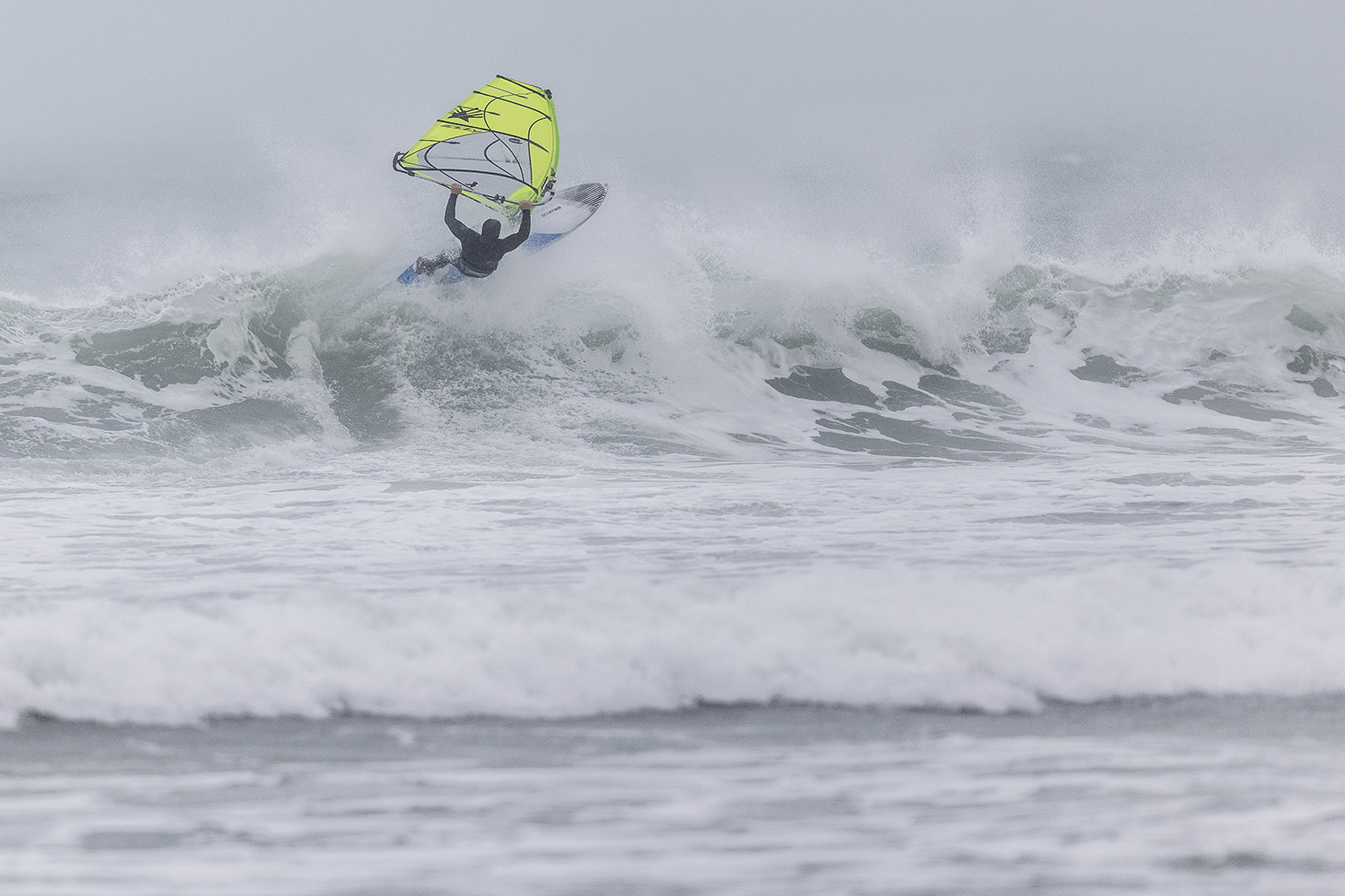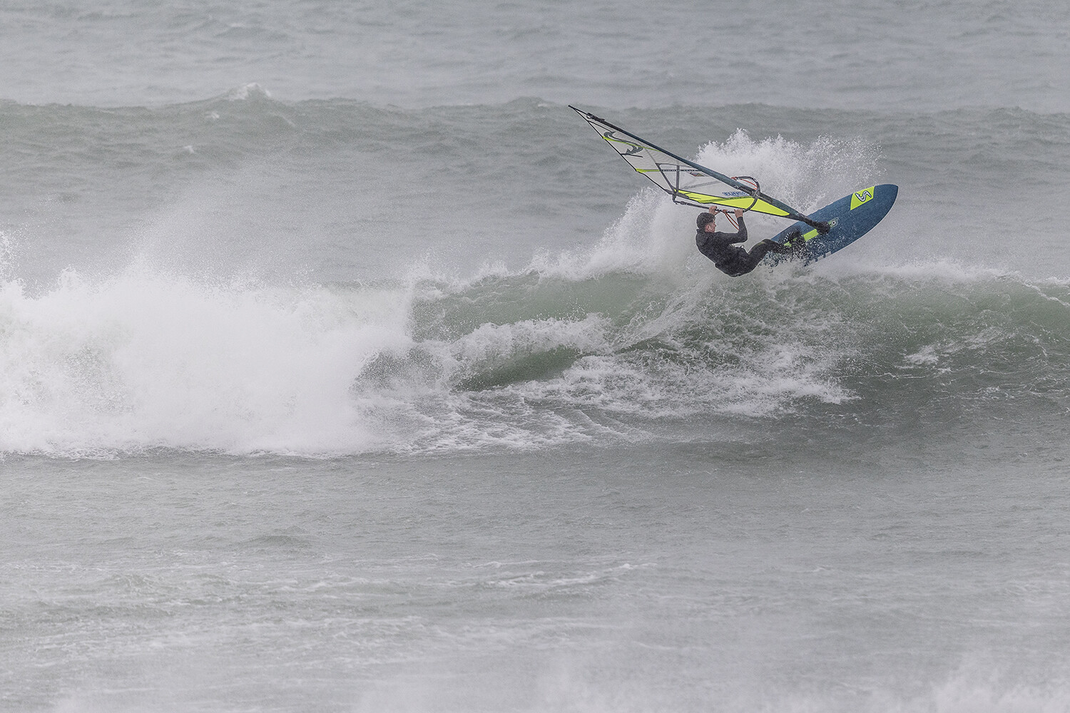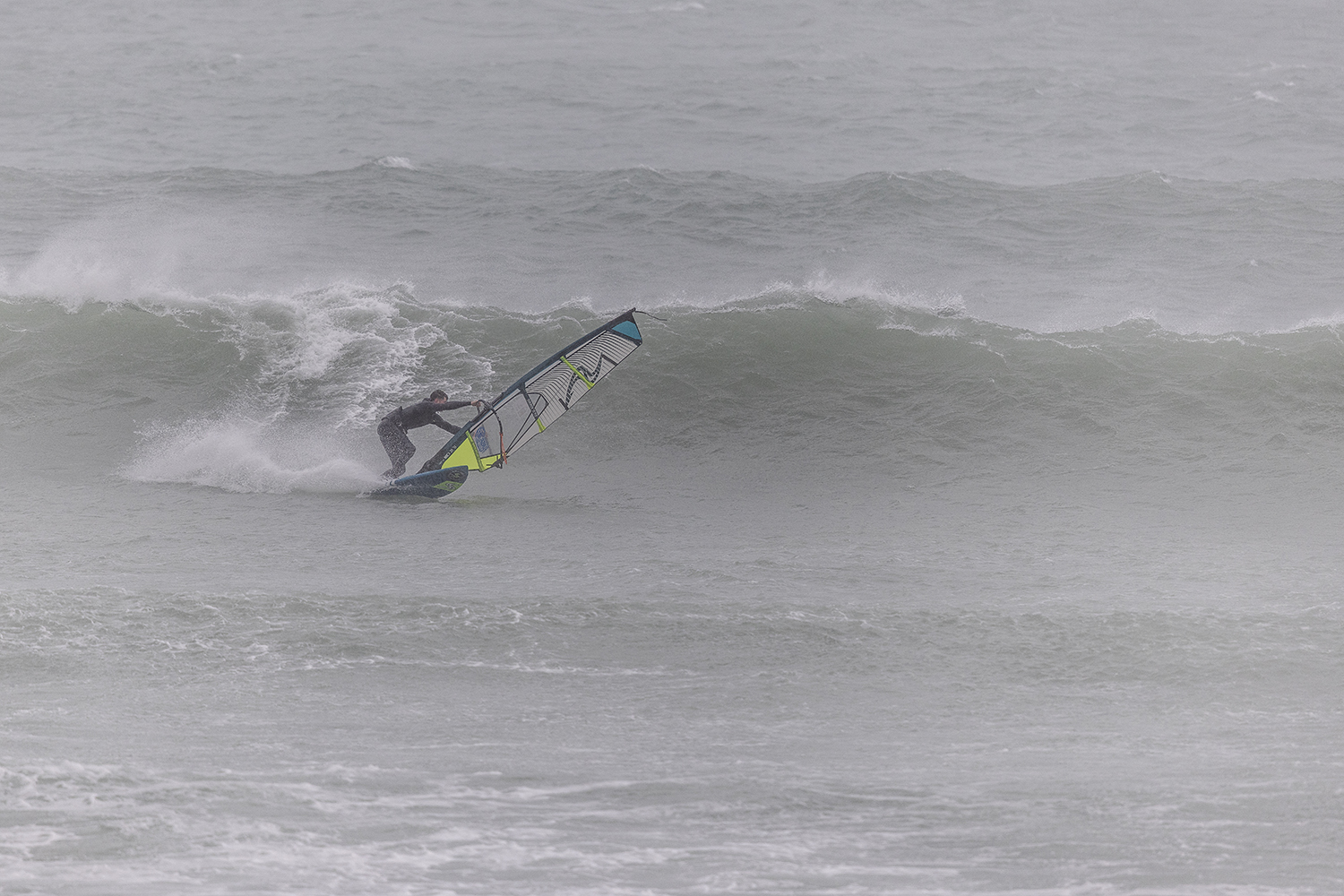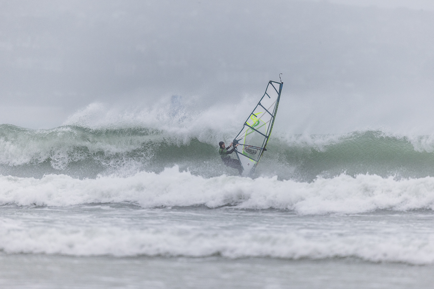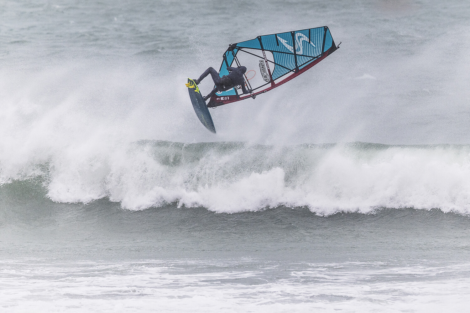 We were up early doors and it was pitch black when we arrived at Gwithian. The wind was blowing so hard we had to hang onto the van doors and it was driving rain just for good measure. When it was finally light enough to see, we make out the huge waves and white caps. I was in the first heat. Normally the top seed is in the last heat, so I was hoping it would be that way around. So, I didn’t get a chance to watch anybody. There was no chance to see what was going on. I had to guess the right equipment and I am not a local at Gwithian so didn’t really know where to take the waves when it was that size. I had to take a punt. I went on my 4m Black Tip Simmer sail and went for it. I was riding my 84L Simmer, Flywave set up as a quad. It is a nice super thin rail board and it really grips in the wave. When you turn tight it can hold lots of power and pressure from the sail. That was great because the wind was so strong.