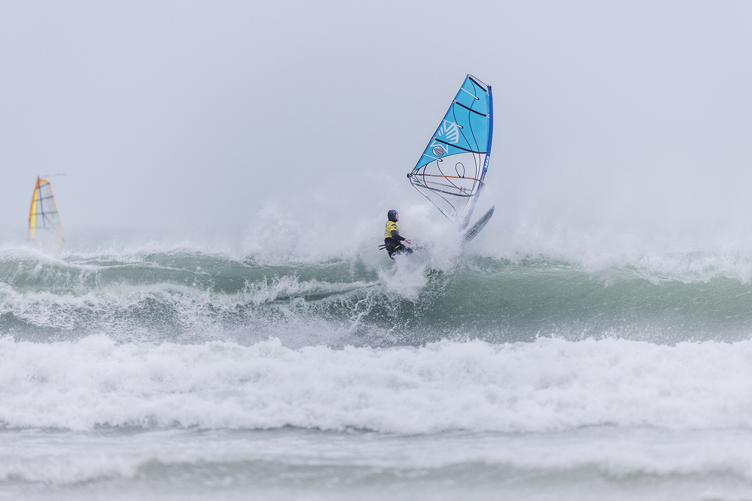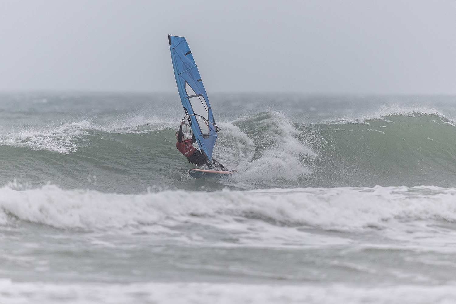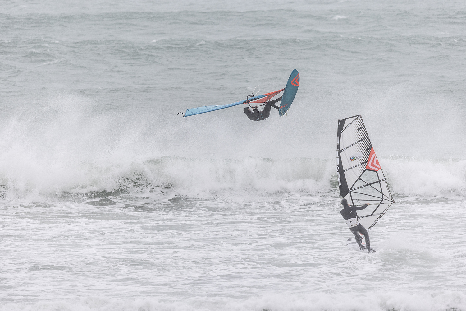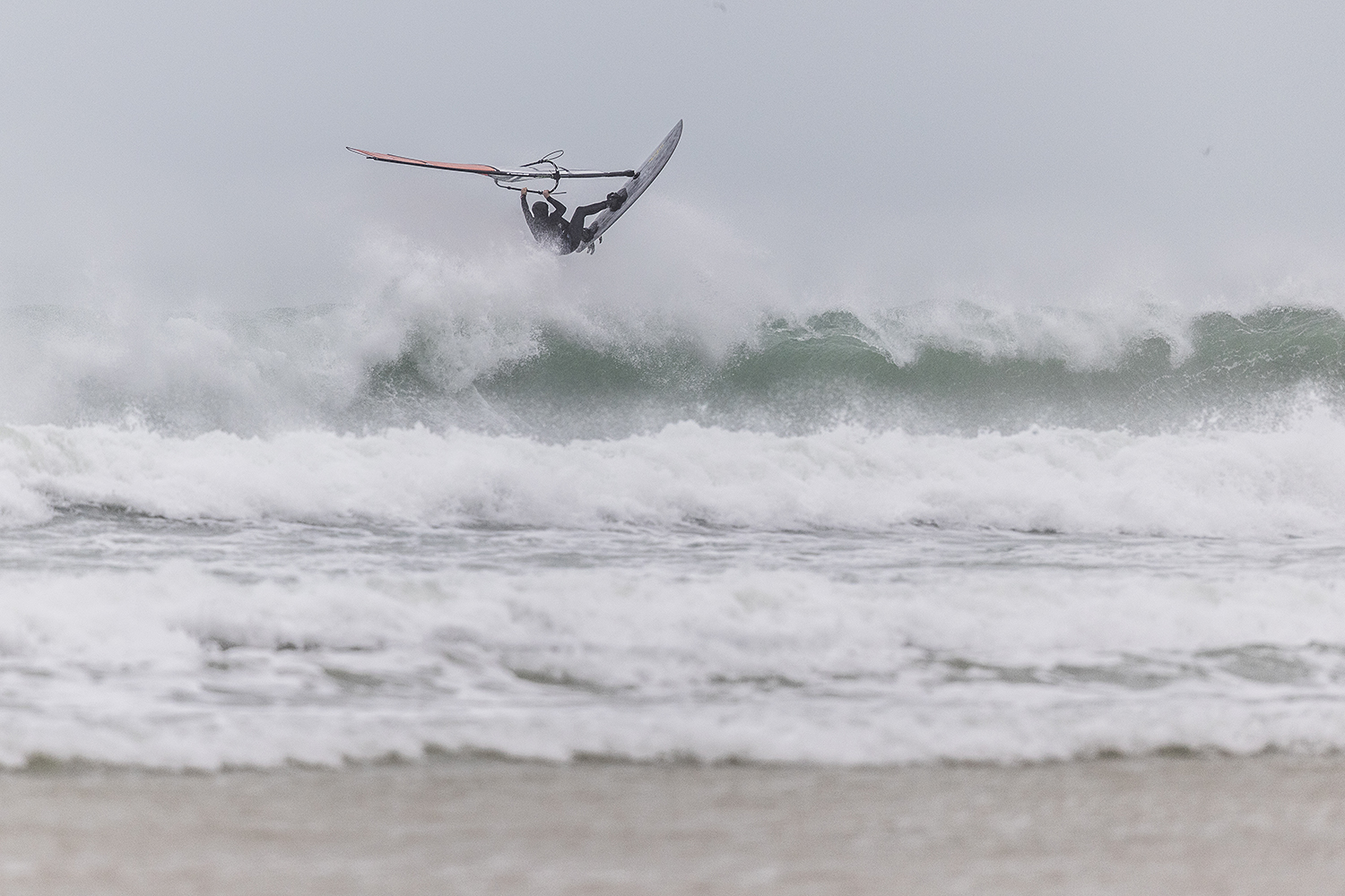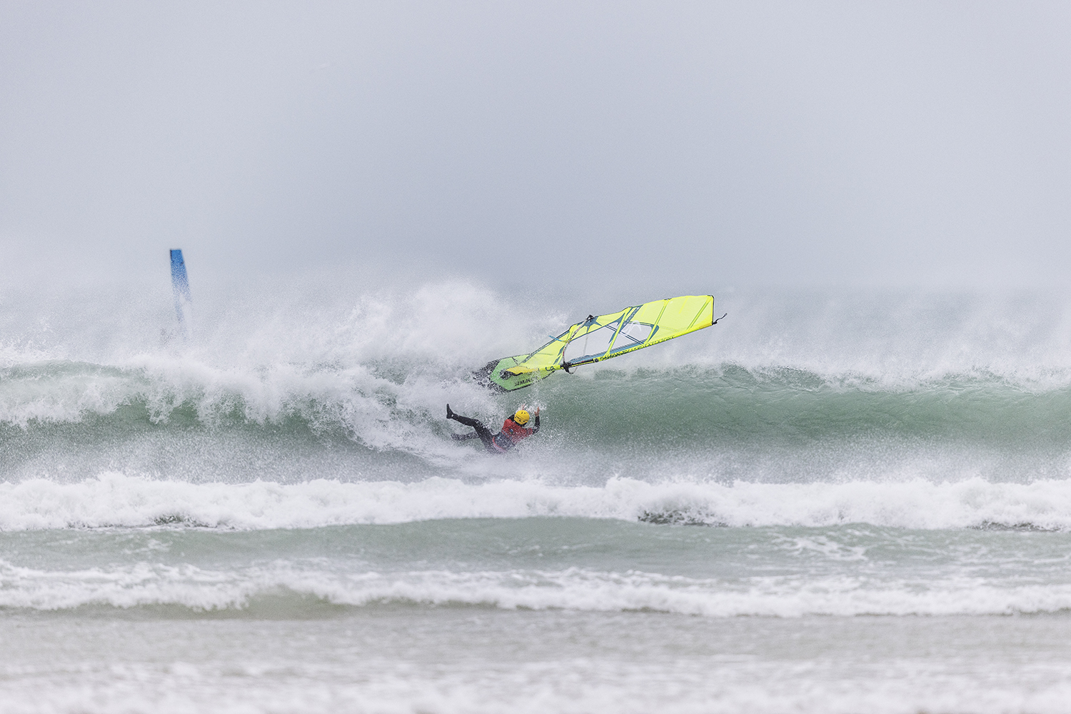 We were up early doors and it was pitch black when we arrived at Gwithian. The wind was blowing so hard we had to hang onto the van doors and it was driving rain just for good measure. When it was finally light enough to see, we make out the huge waves and white caps. I was in the first heat. Normally the top seed is in the last heat, so I was hoping it would be that way around. So, I didn’t get a chance to watch anybody. There was no chance to see what was going on. I had to guess the right equipment and I am not a local at Gwithian so didn’t really know where to take the waves when it was that size. I had to take a punt. I went on my 4m Black Tip Simmer sail and went for it. I was riding my 84L Simmer, Flywave set up as a quad. It is a nice super thin rail board and it really grips in the wave. When you turn tight it can hold lots of power and pressure from the sail. That was great because the wind was so strong.