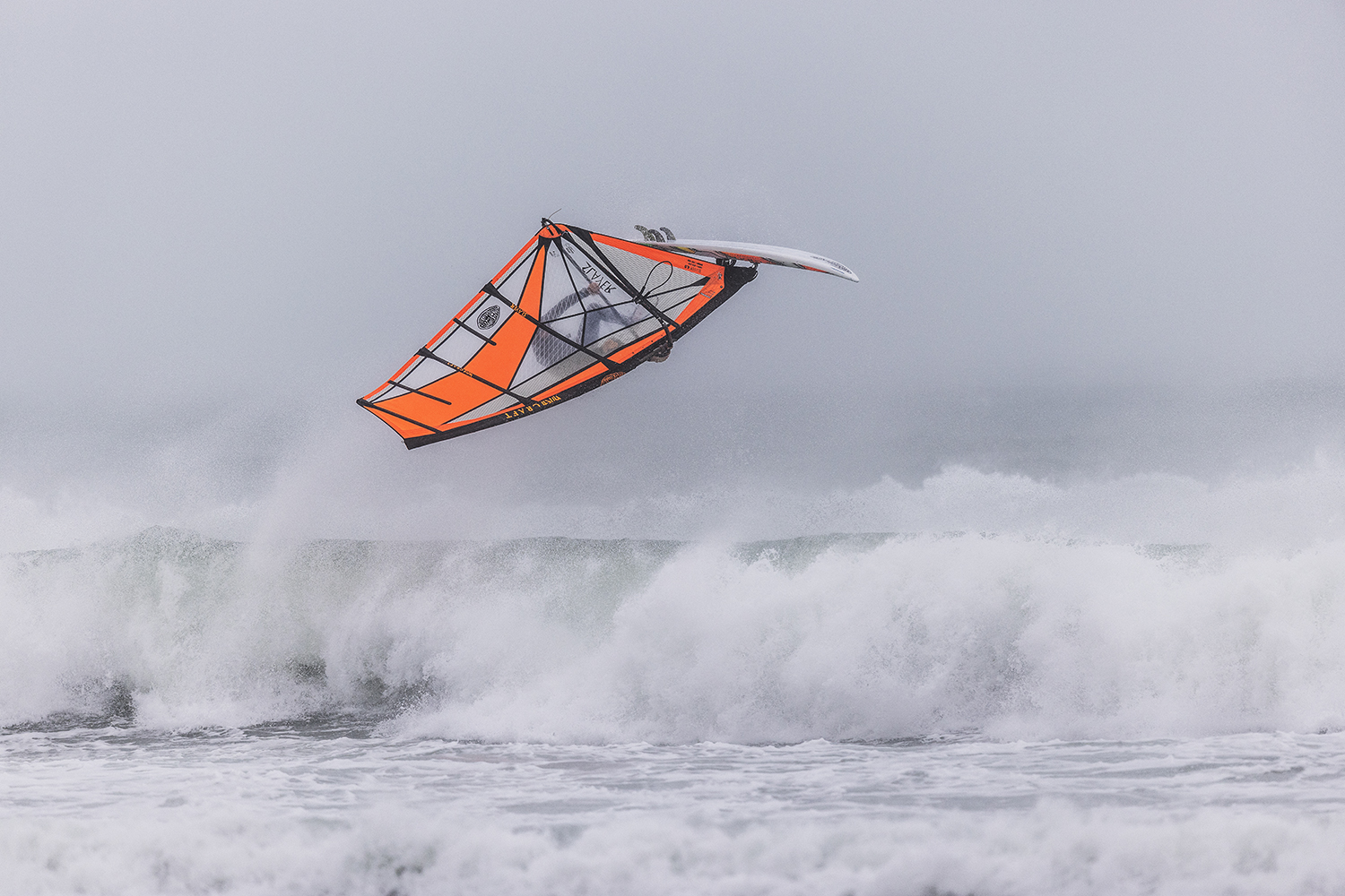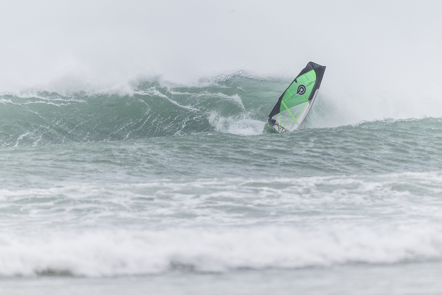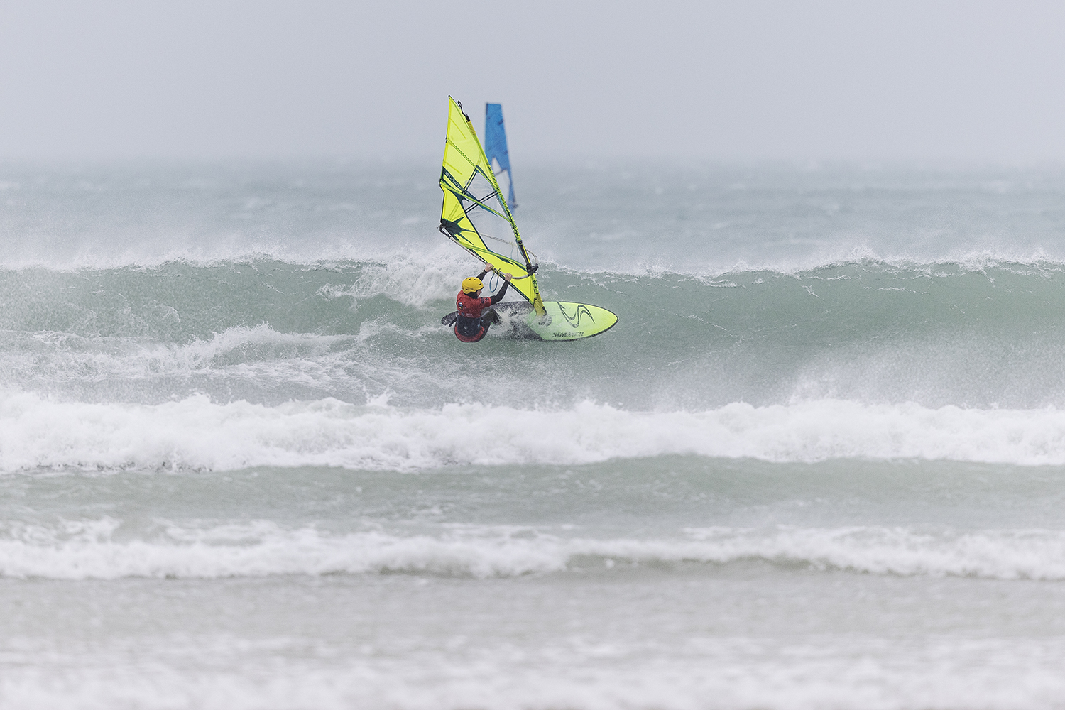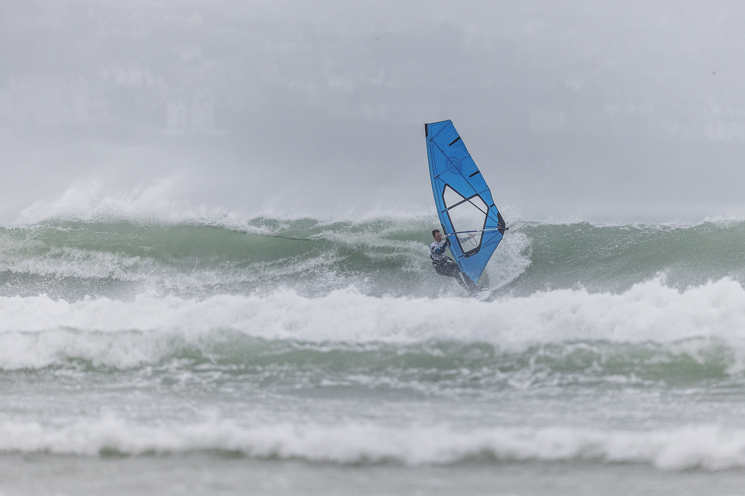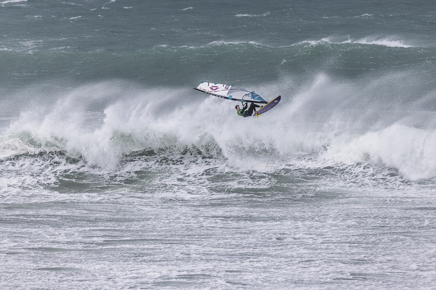 We were up early doors and it was pitch black when we arrived at Gwithian. The wind was blowing so hard we had to hang onto the van doors and it was driving rain just for good measure. When it was finally light enough to see, we make out the huge waves and white caps. I was in the first heat. Normally the top seed is in the last heat, so I was hoping it would be that way around. So, I didn’t get a chance to watch anybody. There was no chance to see what was going on. I had to guess the right equipment and I am not a local at Gwithian so didn’t really know where to take the waves when it was that size. I had to take a punt. I went on my 4m Black Tip Simmer sail and went for it. I was riding my 84L Simmer, Flywave set up as a quad. It is a nice super thin rail board and it really grips in the wave. When you turn tight it can hold lots of power and pressure from the sail. That was great because the wind was so strong.