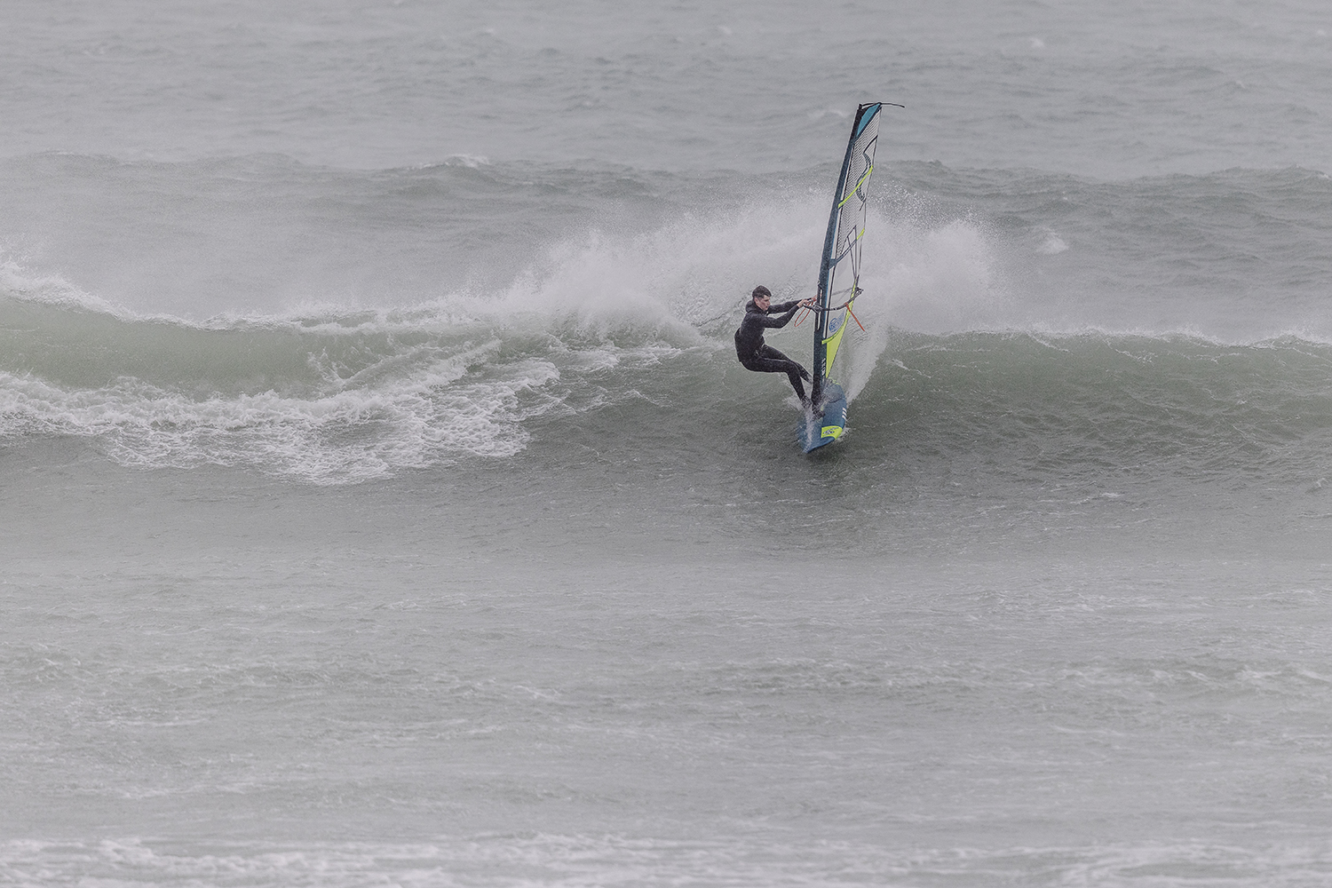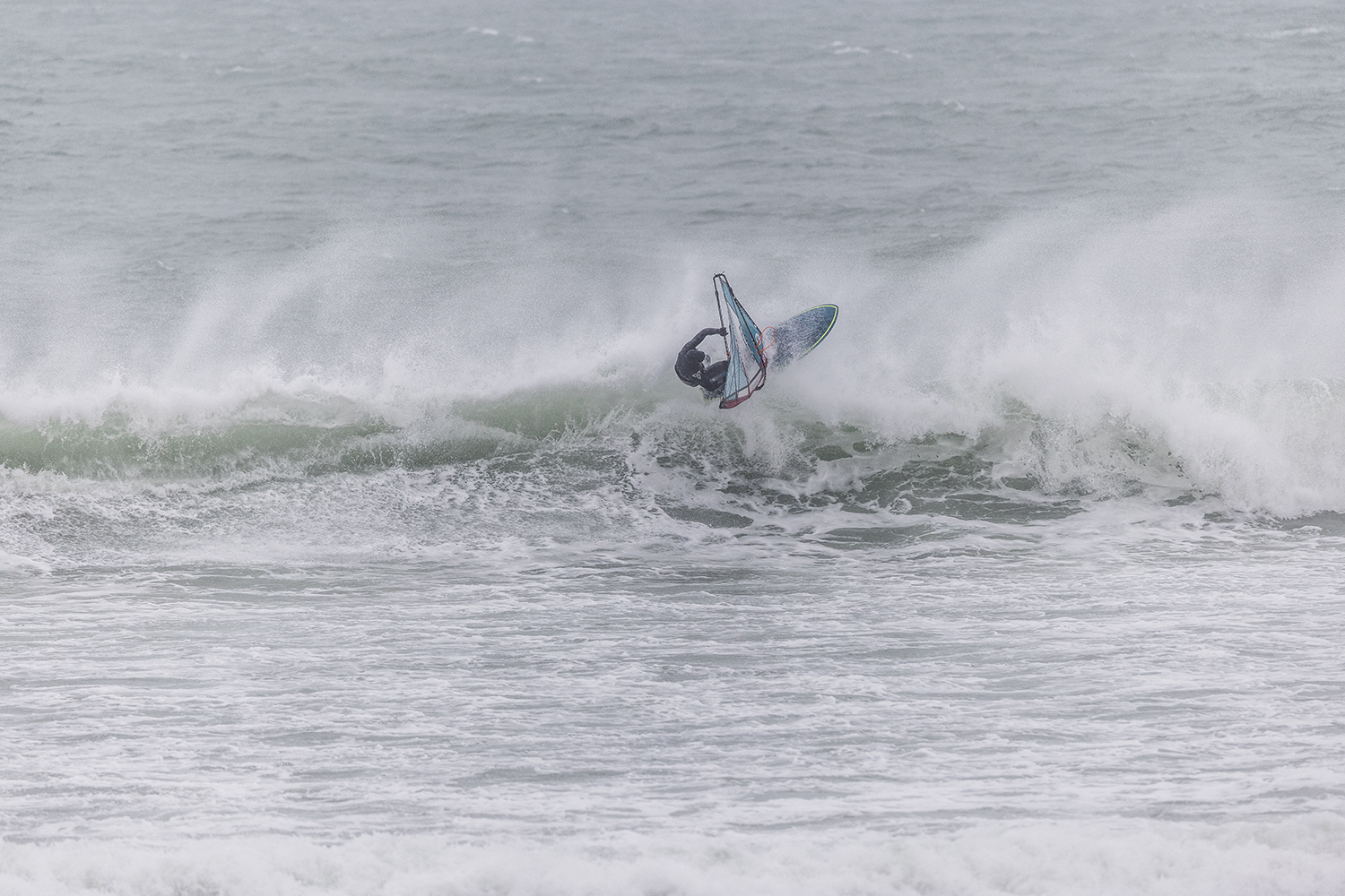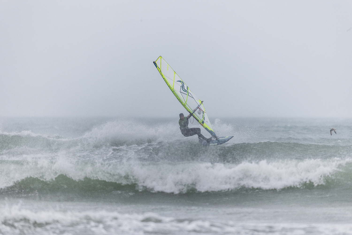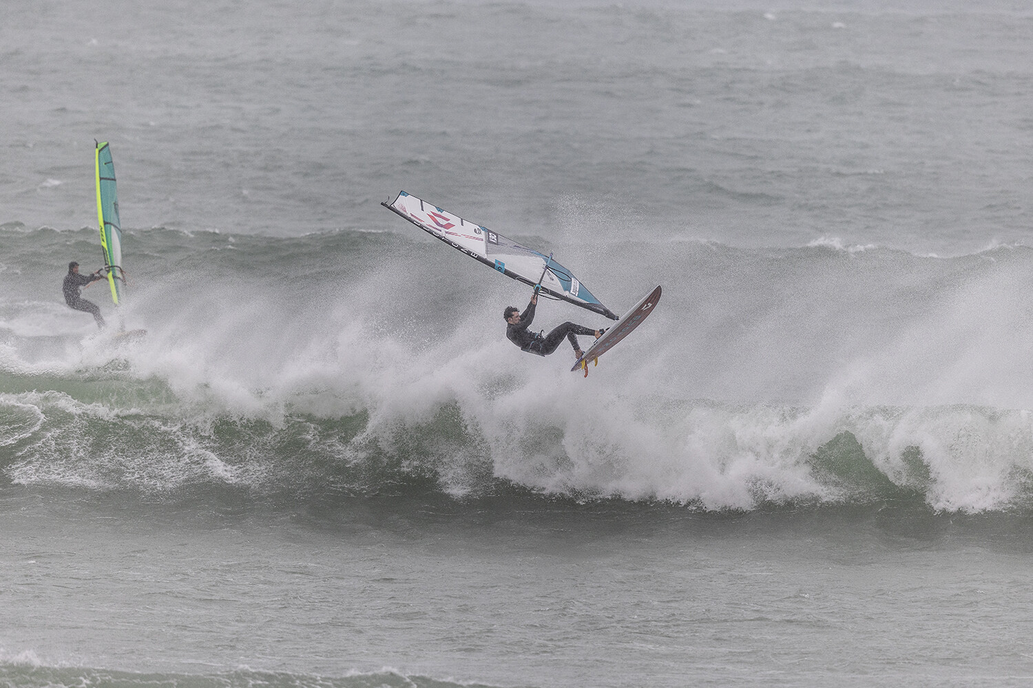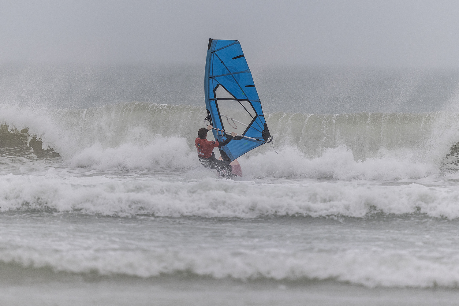 We were up early doors and it was pitch black when we arrived at Gwithian. The wind was blowing so hard we had to hang onto the van doors and it was driving rain just for good measure. When it was finally light enough to see, we make out the huge waves and white caps. I was in the first heat. Normally the top seed is in the last heat, so I was hoping it would be that way around. So, I didn’t get a chance to watch anybody. There was no chance to see what was going on. I had to guess the right equipment and I am not a local at Gwithian so didn’t really know where to take the waves when it was that size. I had to take a punt. I went on my 4m Black Tip Simmer sail and went for it. I was riding my 84L Simmer, Flywave set up as a quad. It is a nice super thin rail board and it really grips in the wave. When you turn tight it can hold lots of power and pressure from the sail. That was great because the wind was so strong.