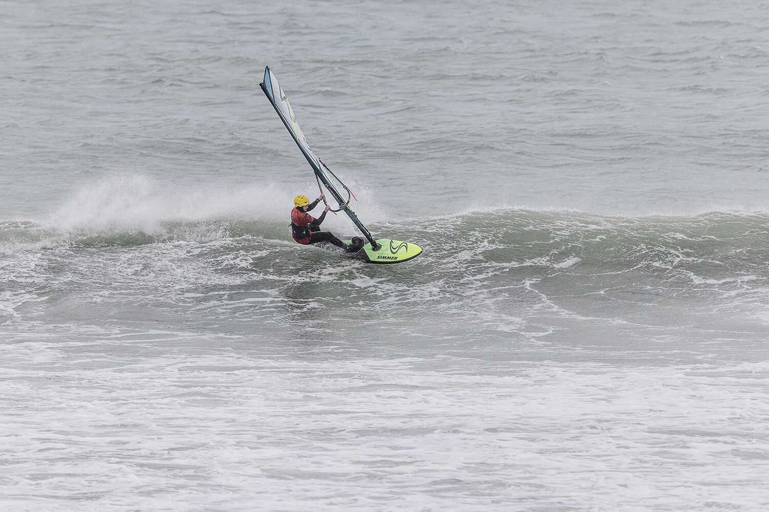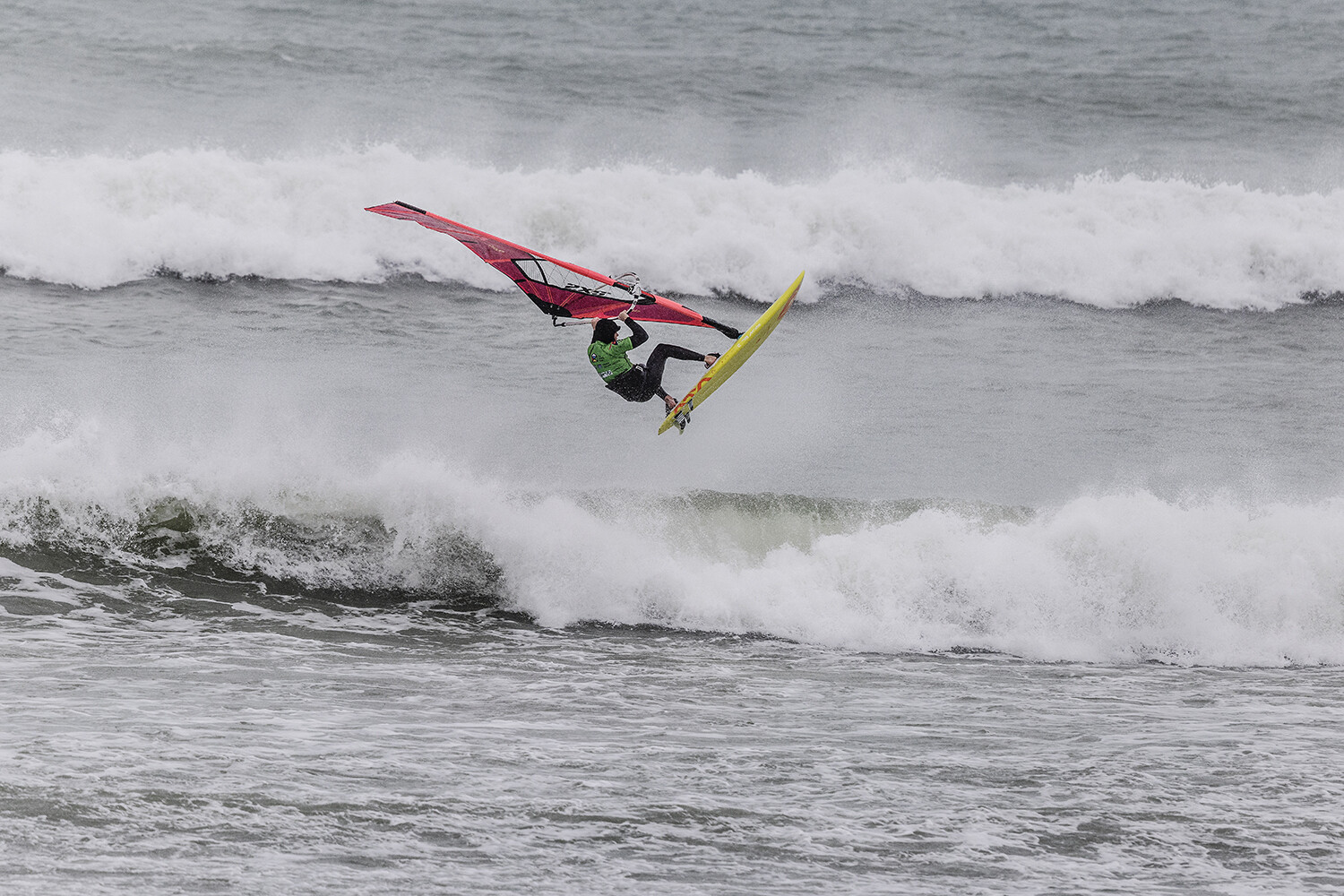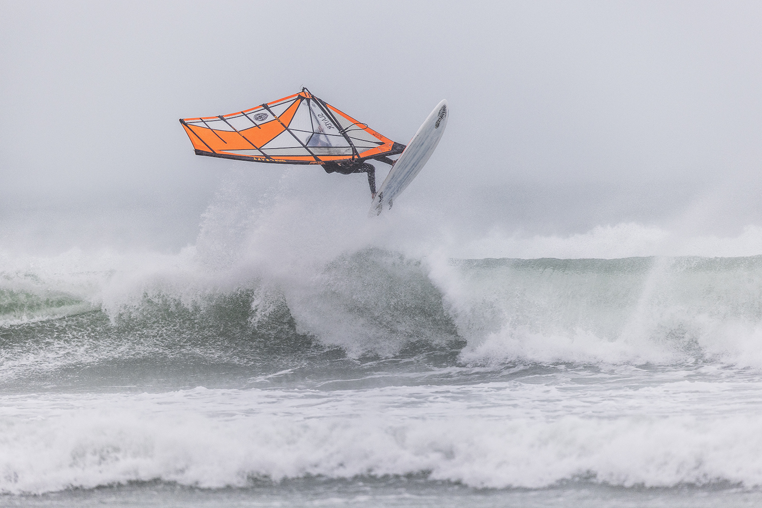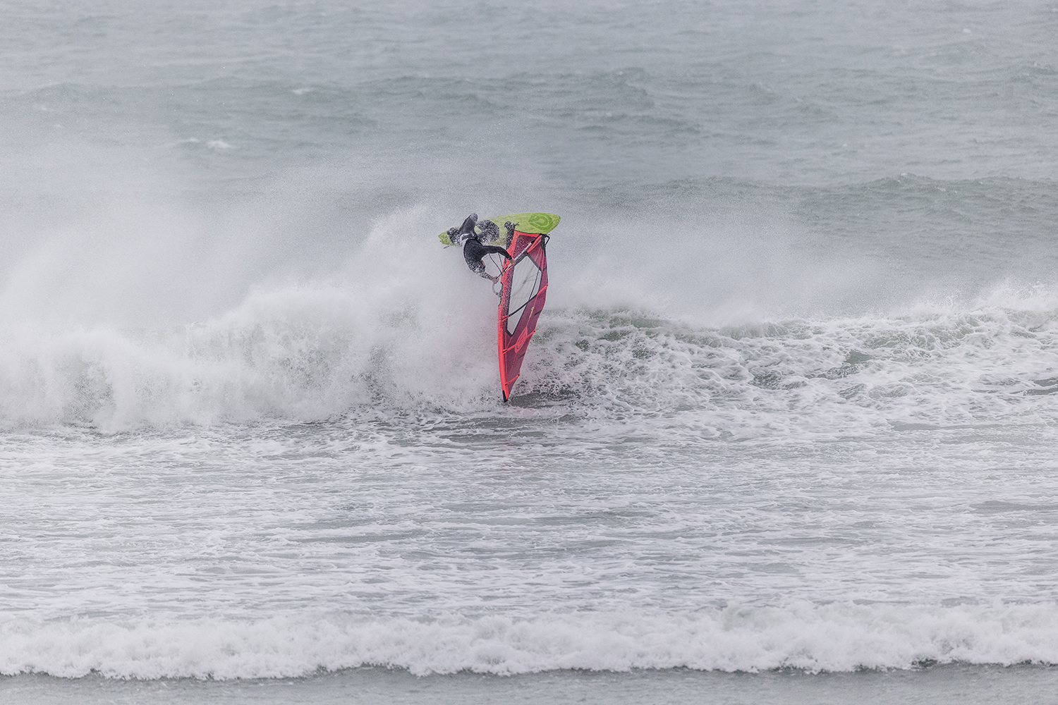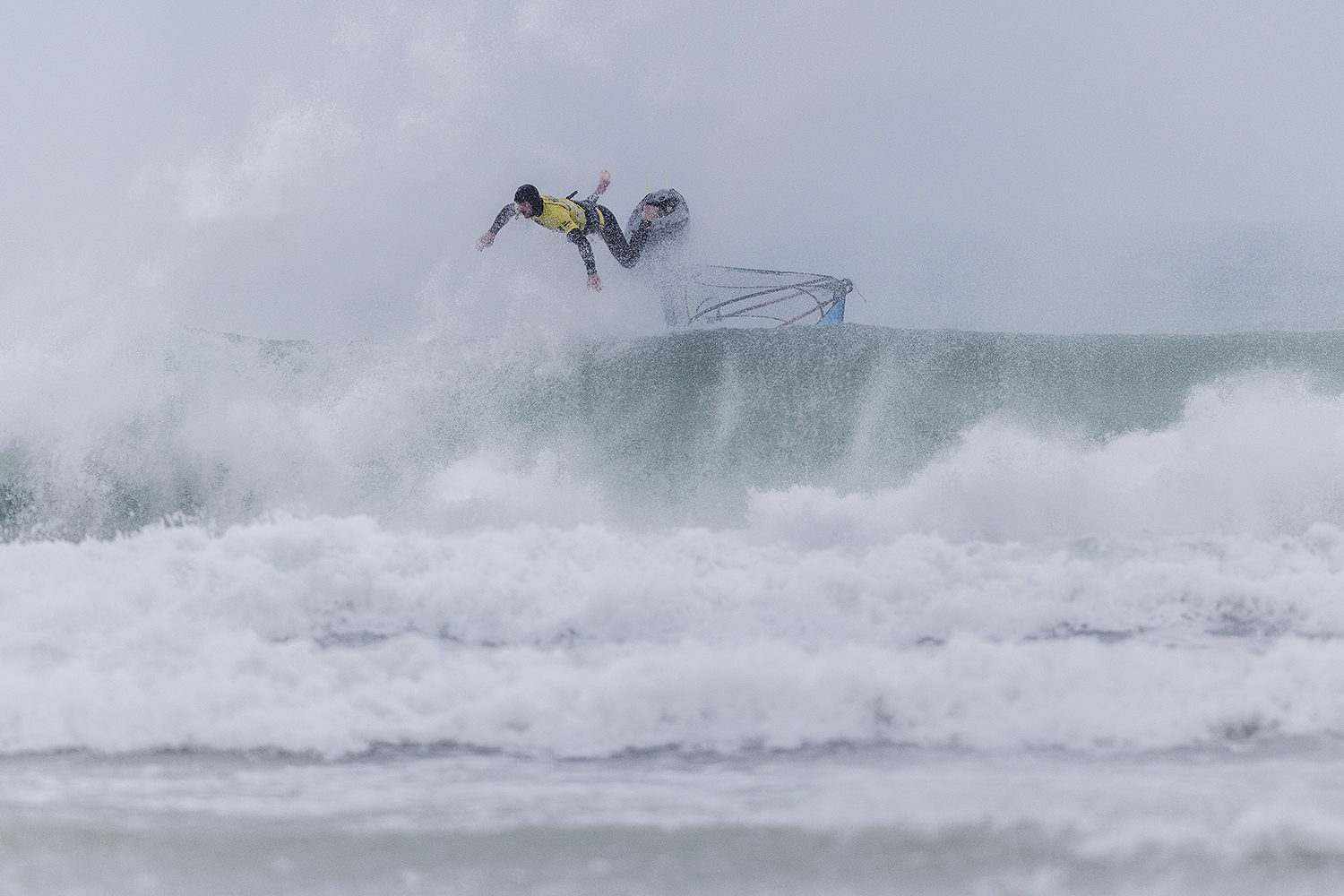 We were up early doors and it was pitch black when we arrived at Gwithian. The wind was blowing so hard we had to hang onto the van doors and it was driving rain just for good measure. When it was finally light enough to see, we make out the huge waves and white caps. I was in the first heat. Normally the top seed is in the last heat, so I was hoping it would be that way around. So, I didn’t get a chance to watch anybody. There was no chance to see what was going on. I had to guess the right equipment and I am not a local at Gwithian so didn’t really know where to take the waves when it was that size. I had to take a punt. I went on my 4m Black Tip Simmer sail and went for it. I was riding my 84L Simmer, Flywave set up as a quad. It is a nice super thin rail board and it really grips in the wave. When you turn tight it can hold lots of power and pressure from the sail. That was great because the wind was so strong.