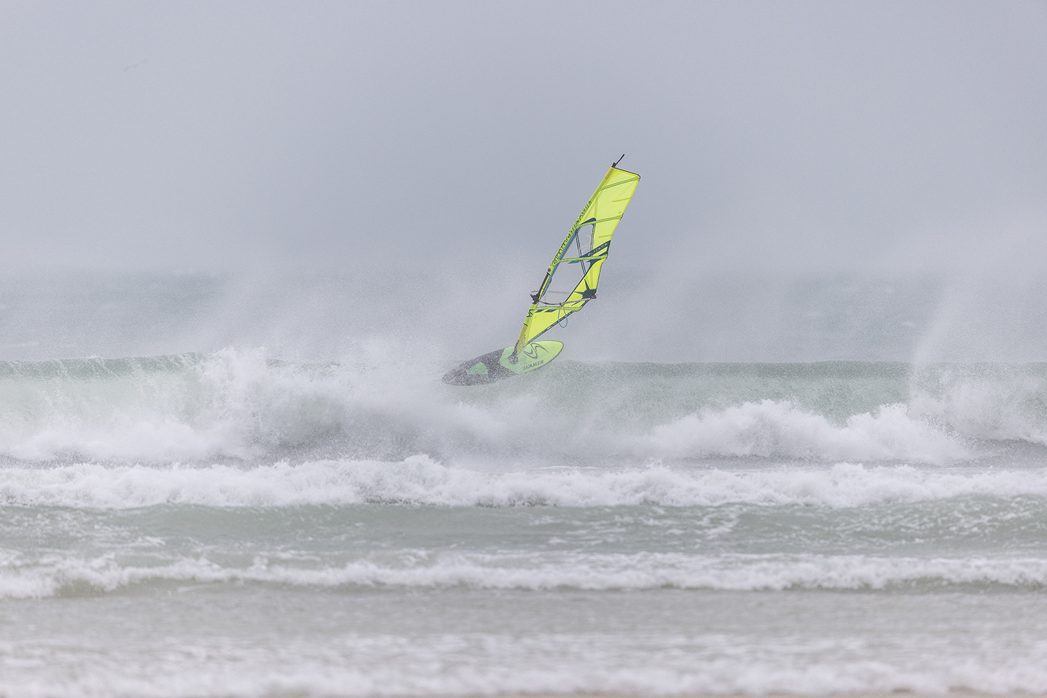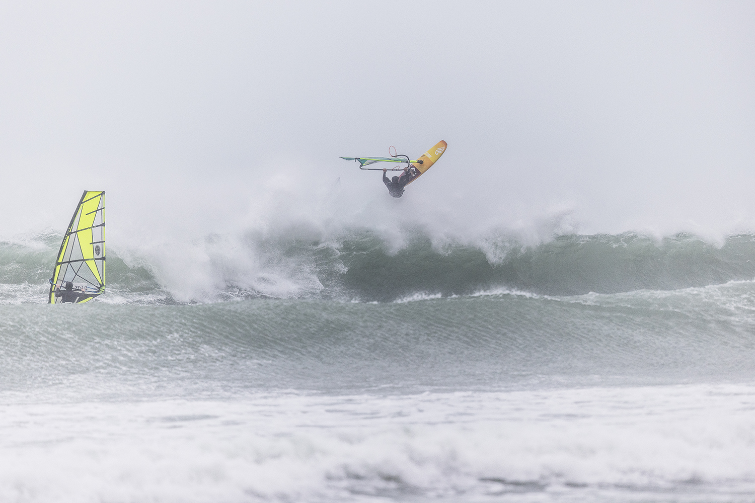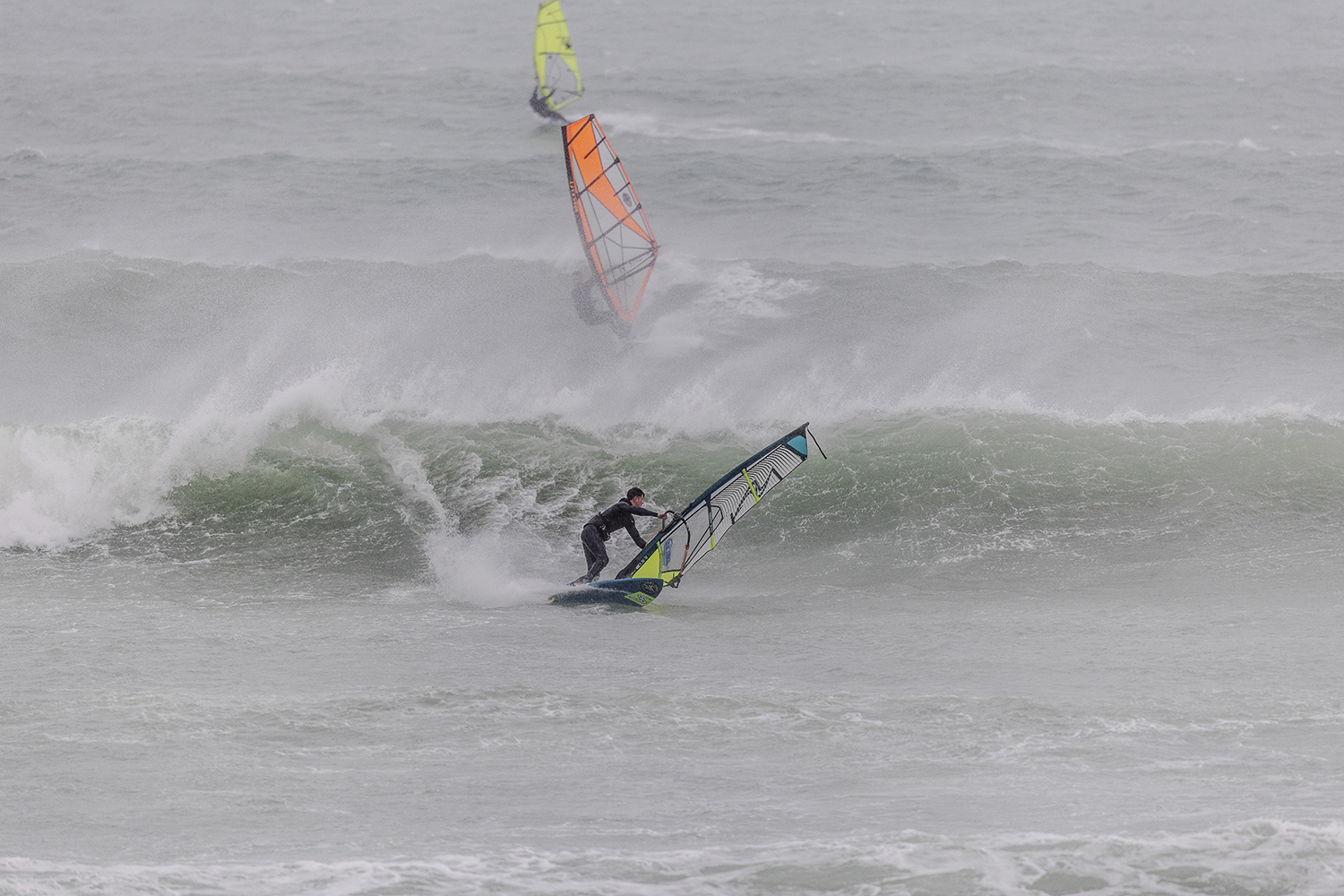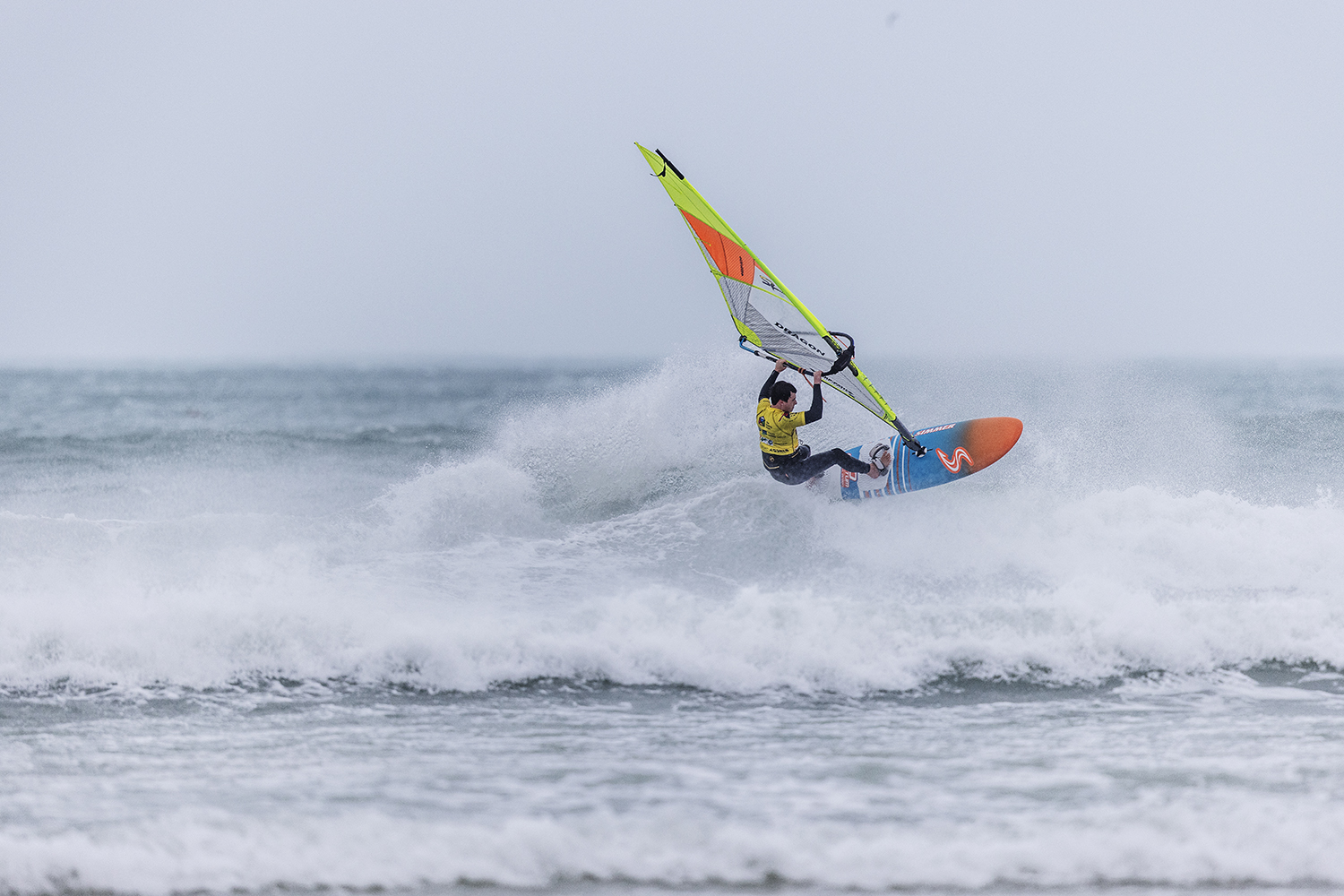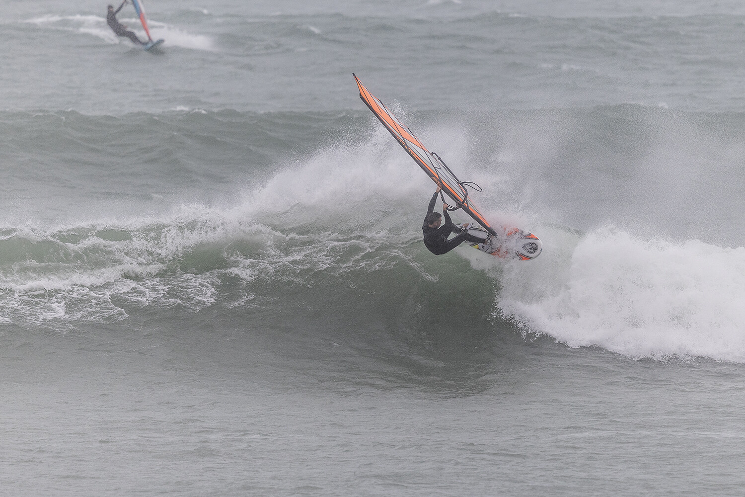 We were up early doors and it was pitch black when we arrived at Gwithian. The wind was blowing so hard we had to hang onto the van doors and it was driving rain just for good measure. When it was finally light enough to see, we make out the huge waves and white caps. I was in the first heat. Normally the top seed is in the last heat, so I was hoping it would be that way around. So, I didn’t get a chance to watch anybody. There was no chance to see what was going on. I had to guess the right equipment and I am not a local at Gwithian so didn’t really know where to take the waves when it was that size. I had to take a punt. I went on my 4m Black Tip Simmer sail and went for it. I was riding my 84L Simmer, Flywave set up as a quad. It is a nice super thin rail board and it really grips in the wave. When you turn tight it can hold lots of power and pressure from the sail. That was great because the wind was so strong.