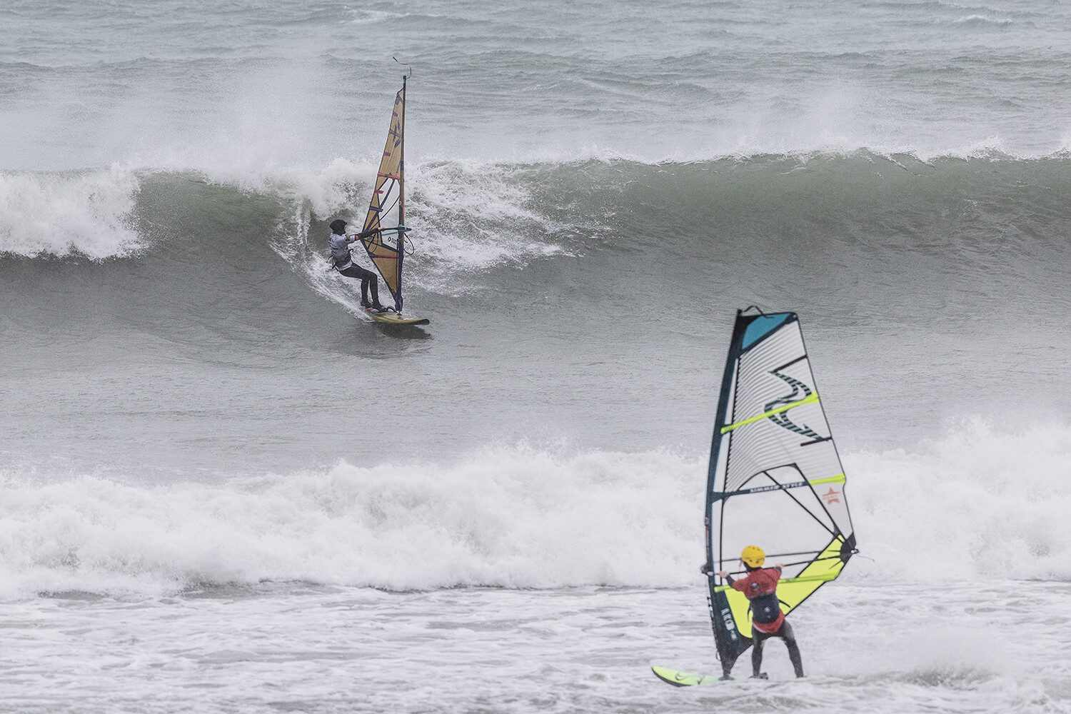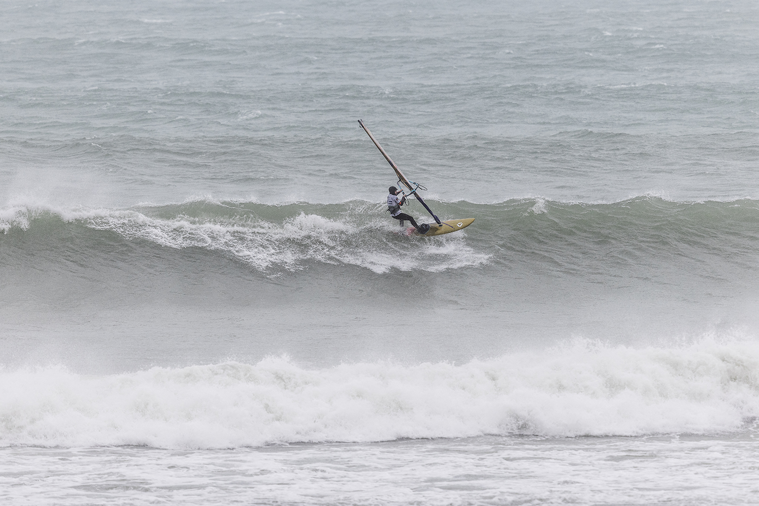 I did not want to go on the rocks, but I went there in one heat. I was riding my 69L Duotone Grip Quad, with a 3.7m and 4m in the later heats. I could have been on a smaller sail on the wave but to be able to get back out, I took a bit bigger. I have the new D / Lab sails which are a bit lighter, you can hold them down and they have a bigger range. That helped me hold onto a bigger sail in those conditions. I survived the storm and am happy its over. Sunday was more fun and rippable.