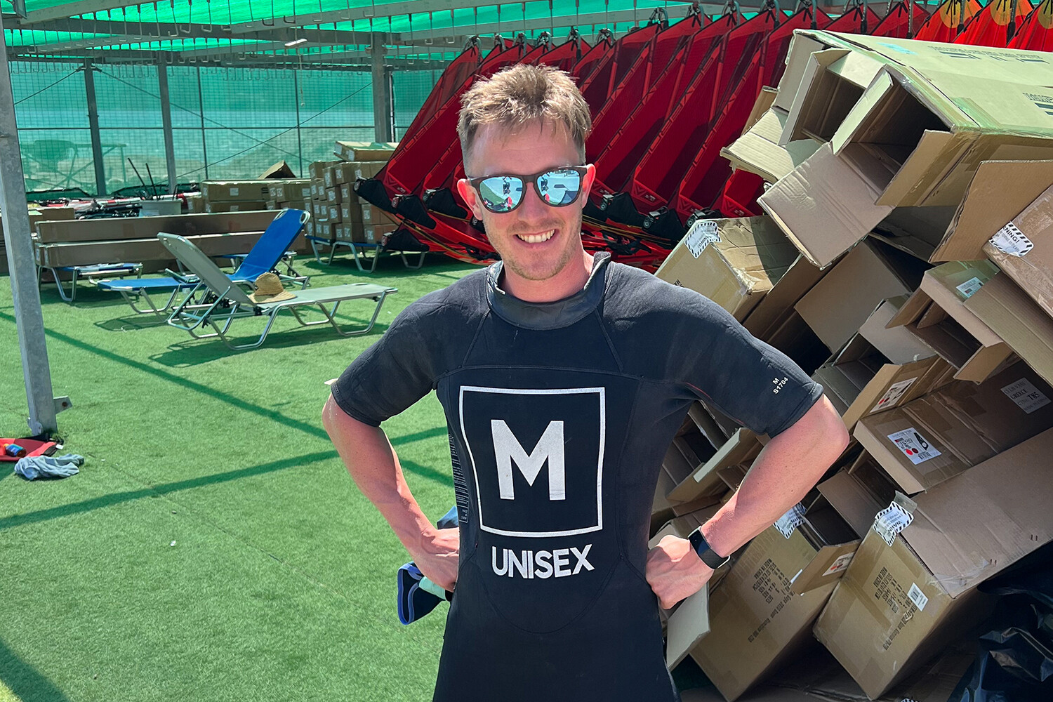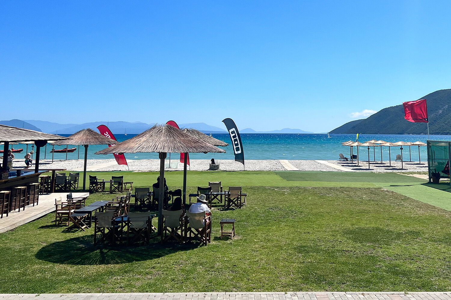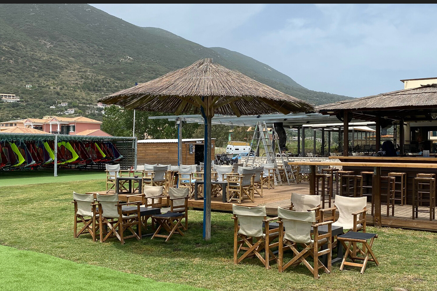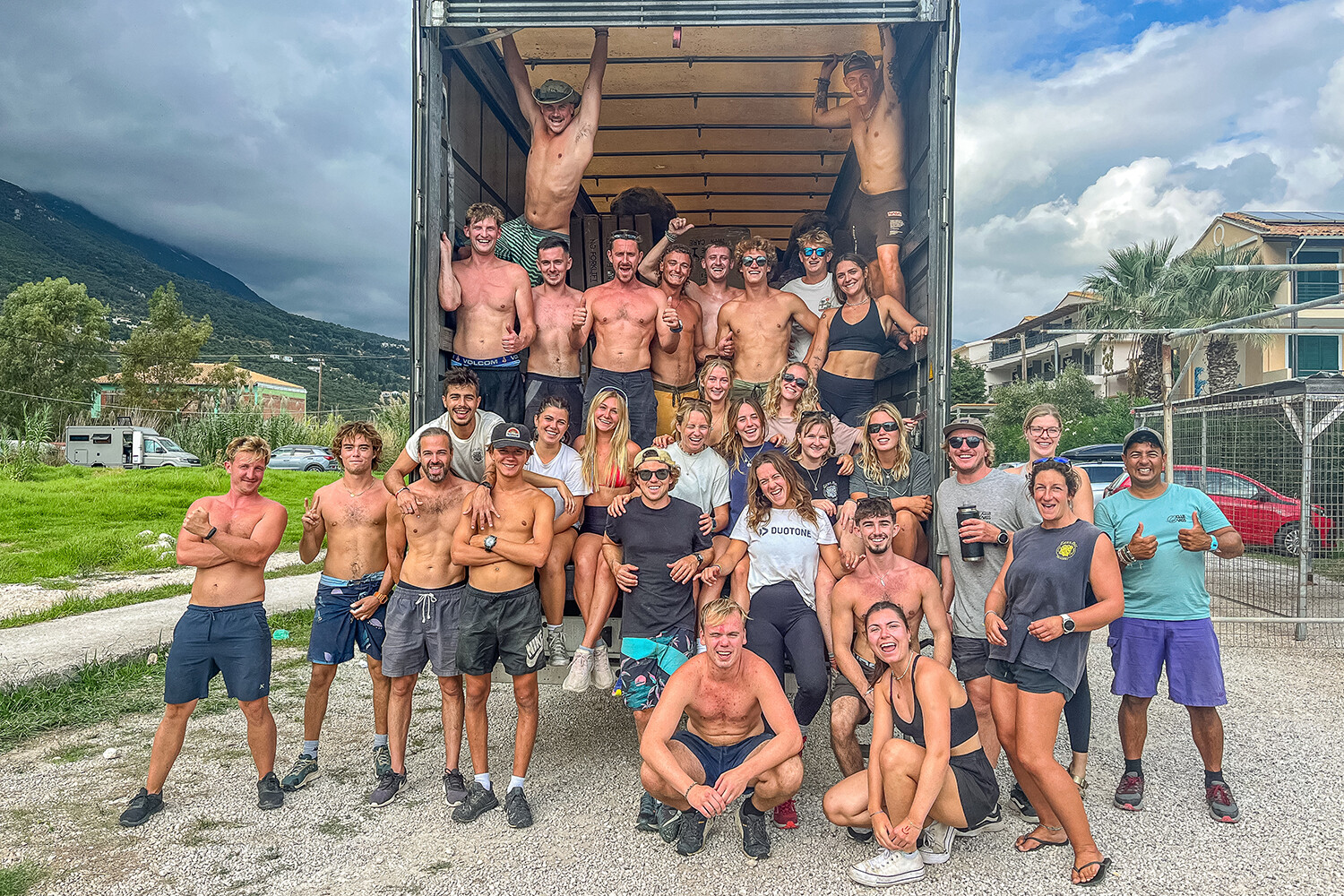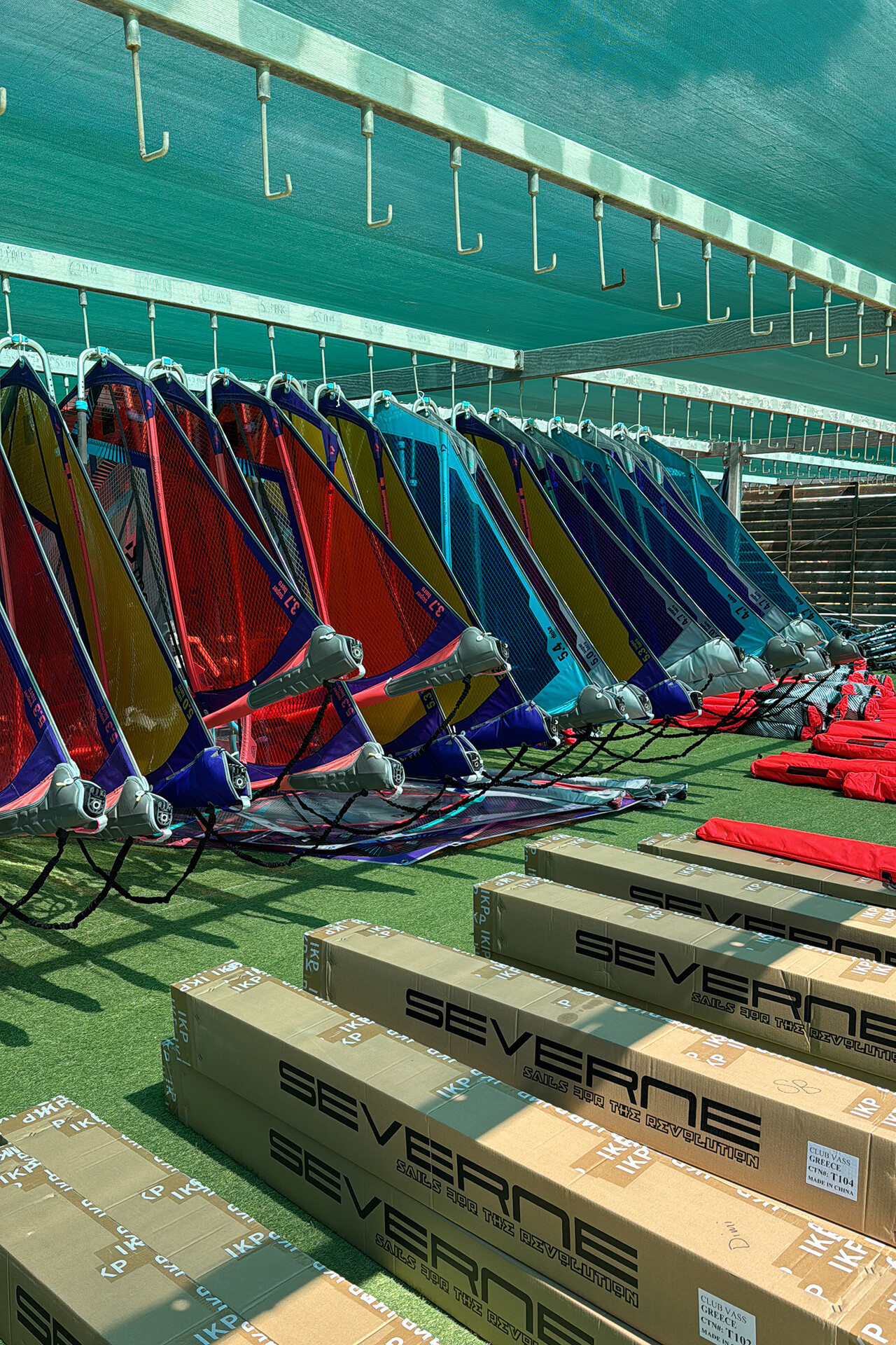 First, the team rebuilds board and sail racks, sets up the watch tower, organises rental areas, and lays down “grass carpets” and decking, for comfort-launching and to protect all that precious equipment. Every year, a huge batch of brand-new windsurf and wing gear arrives via lorry (usually from the Far East via Athens). When the truck rolls in, it’s all hands on deck, with everyone mucking in to unload and carry the gear to the rigging area.