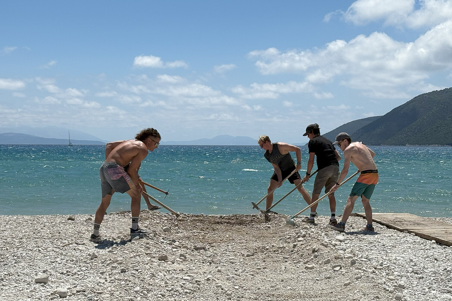 By April, Vassiliki shakes off its short winter hibernation and the ‘endless-summer-swallows’ start to make their way back. Among the first to fly in is manager Ollie Scott, fresh from his winter adventures, which this year included Cape Town, Bali and Sumatra. Max Rowe and Adam Chubbock (Watersport Nomads) are already in place, having spent quite a bit of the winter here, with their kids attending the local school, which just shows how infectious this place is. Hotel Manager Sarah arrives after a spell working on the yachts in Palma, followed by some of the senior team, including Tom, Benita and Eoin, having also wintered in exotic climes. Chefs Tim and Brad along with Greek coach Tilemachos head over from the Alps and Dan and Hannah arrive fresh-and-freestyled from Bonaire. It’s a tough life, but someone’s got to do it! With around two weeks to go before opening, the rest of the set-up squad trickle in from various corners of the globe and it’s all go…