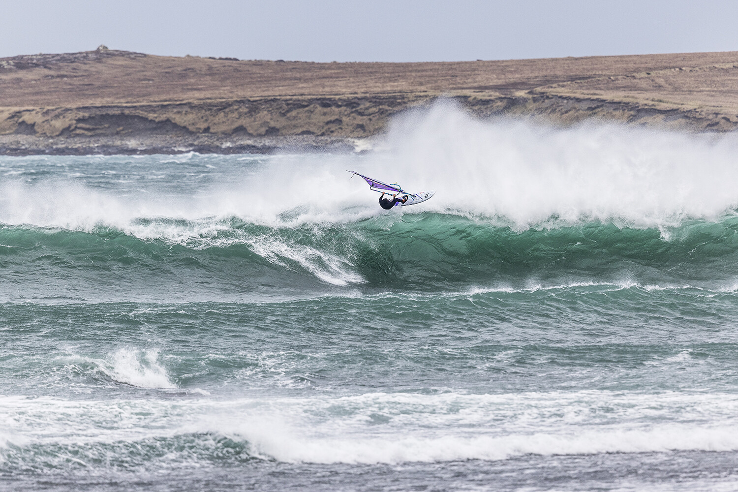 1.30pm: Finn has to come off the water for a work zoom call…doh… but not to worry his wife Katie is subbed on to take over on the water. Katie is on a 3.7m and looked maxed out on the wave.