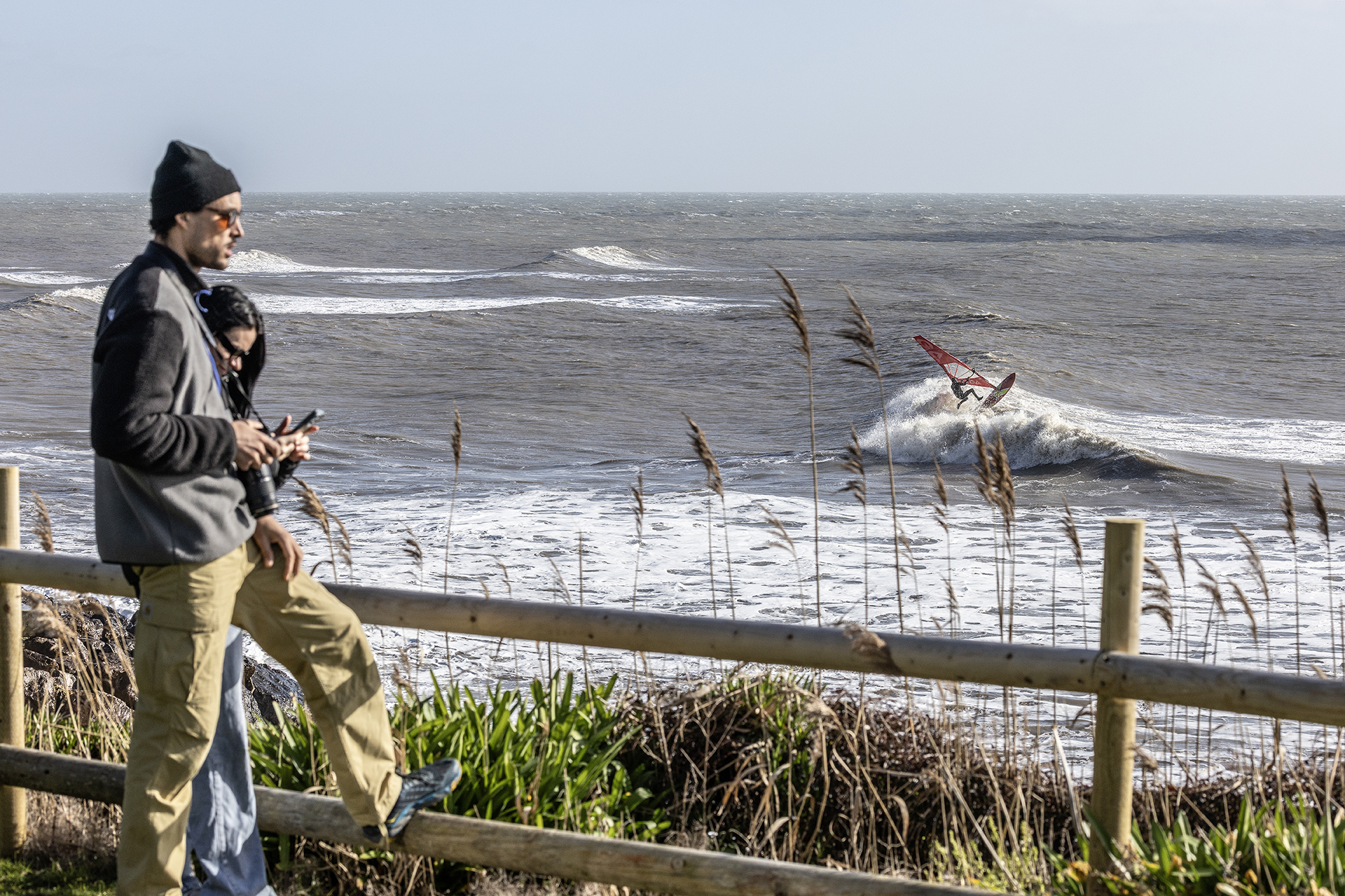When we arrived, the waves were already solid. The tide had just turned, the lineup was cleaning up nicely, and there was only one surfer in the water…always a welcome bonus. Ross Williams took his time rigging his trusty 4.8m Gaastra Manic and Tabou Da Curve 88L before heading down to launch, while I readied the cameras.