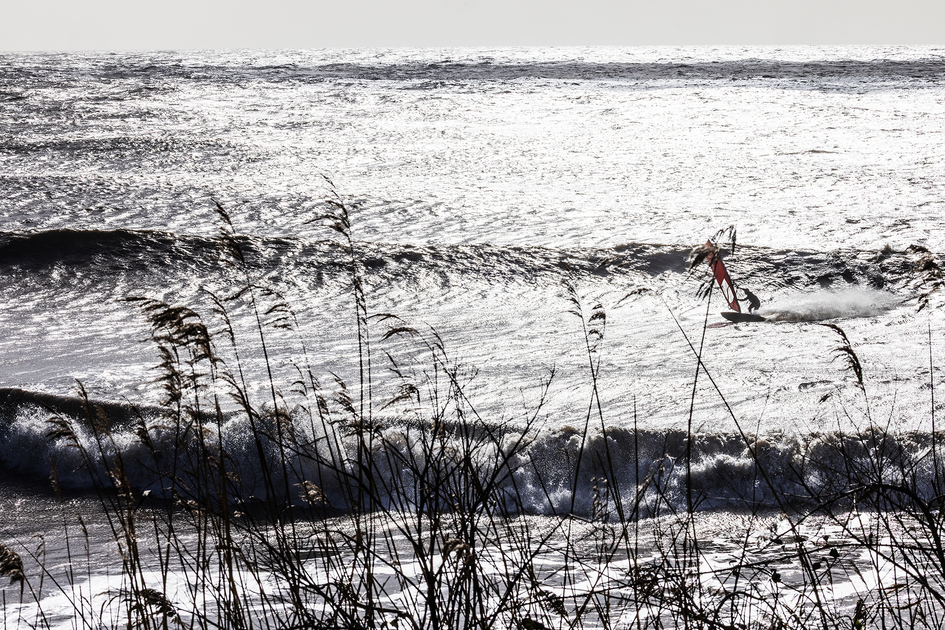 It wasn’t long before Ross was back in the thick of it. The sun punched through the dark clouds in short bursts, bringing with it some stronger gusts. He picked off the better sets and scored some solid rides despite the ever-tricky conditions. Eventually, the clouds won their battle with the sun…but just as the weather turned for the worse, the sailing turned on.