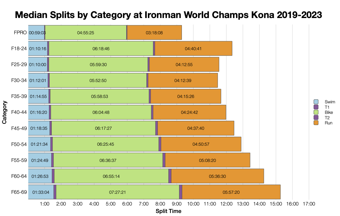 The DNF numbers above are not segregated on gender so use them as a guide to whether a race year was tougher/slower than others. With that in mind this year look typical for Kona, while 2023 appears to have been a particularly good year for the course.