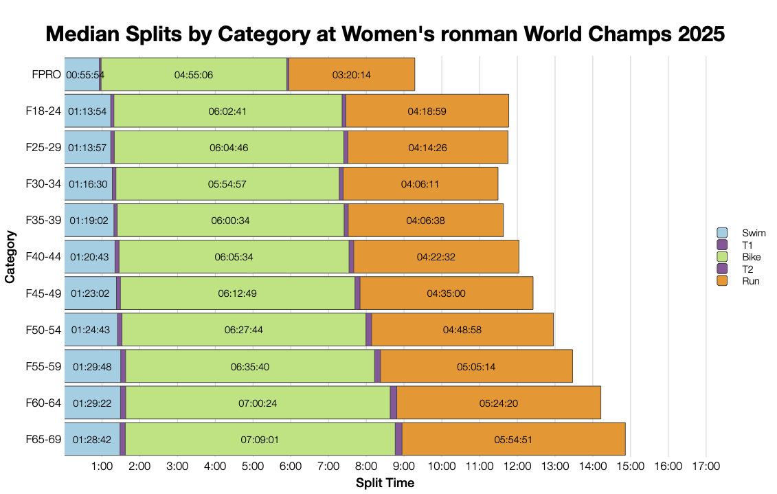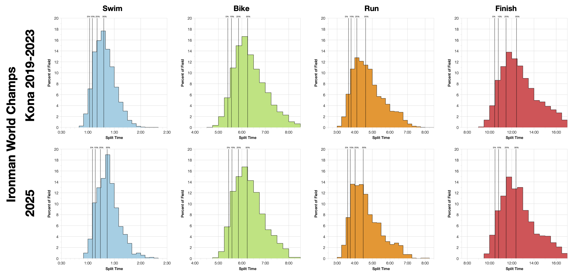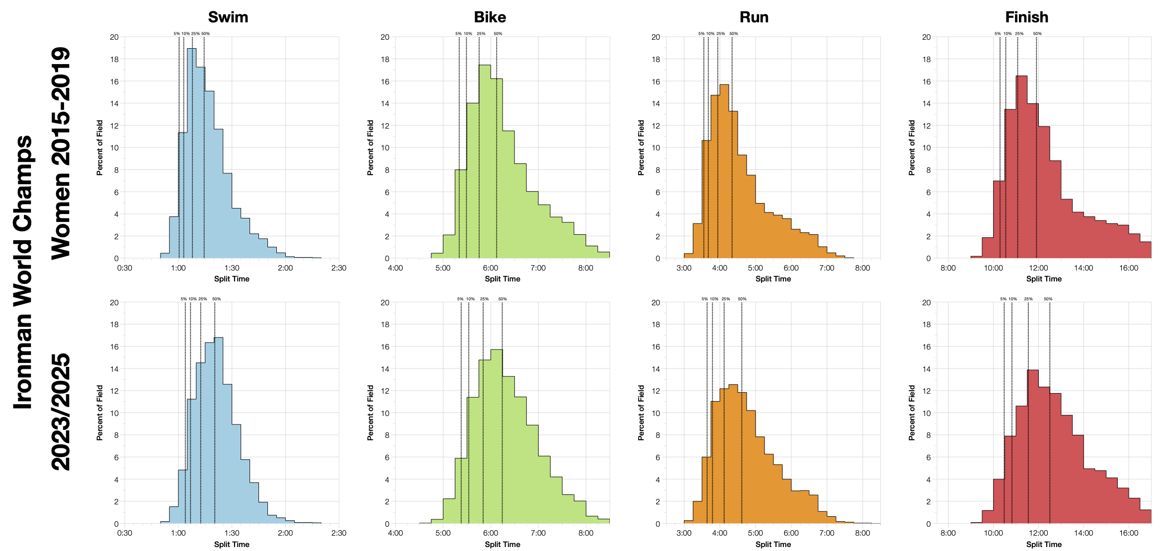 For the second distribution I’ve compared the two (2023, 2025) fully independent women’s races in Kona with 5 years of women’s results from joint races. What we see here is a clearly slower race at the average, at least 30 minutes difference, but a more comparable race at the front. The major source of that difference is the run, with some contribution from the swim. Bike splits are more comparable.
