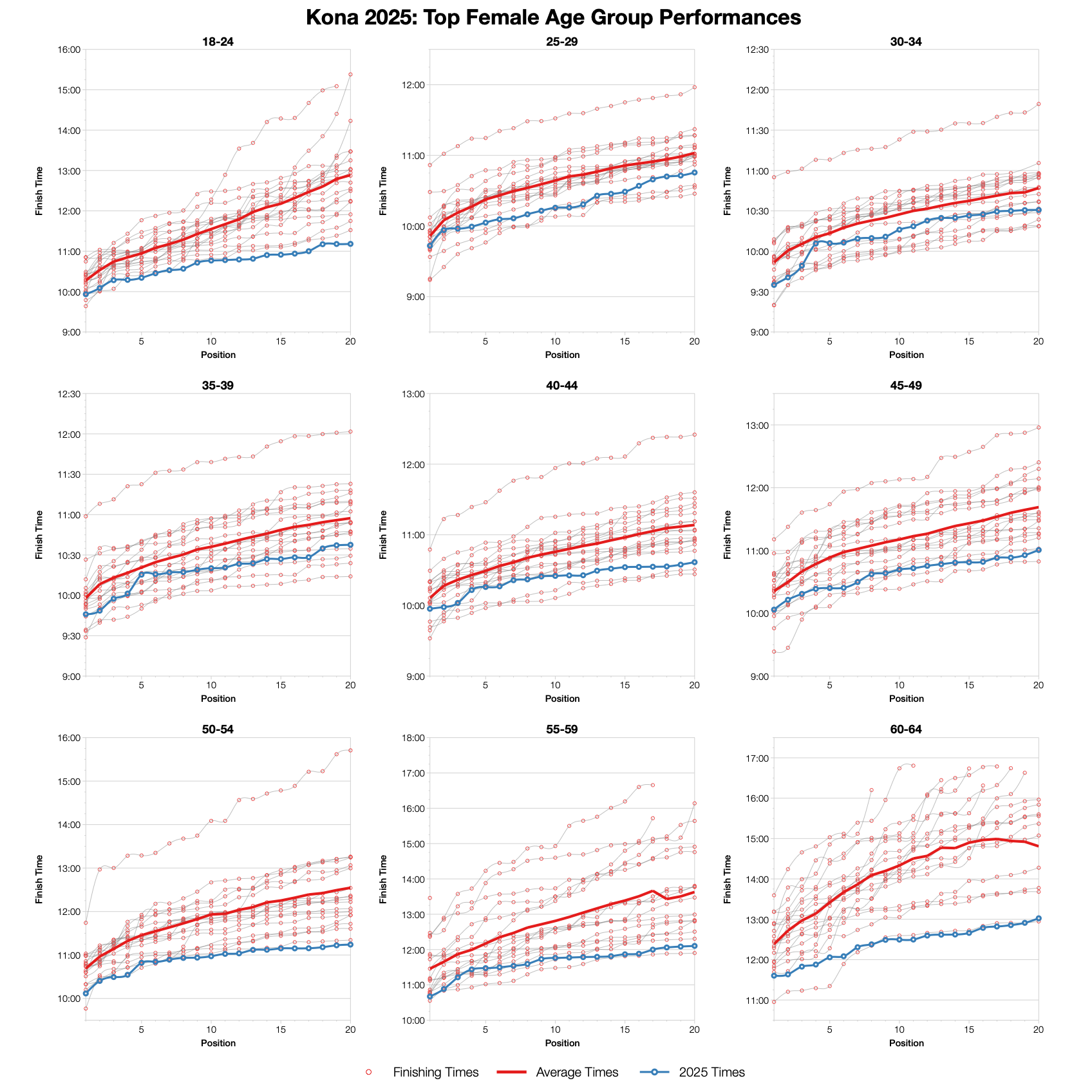 Overall this year’s championship compares well with recent years in Kona. The separate and larger women’s championship did see some decrease to the median finish time, but the front of pack remained as competitive with a number of age groups being near their fastest.