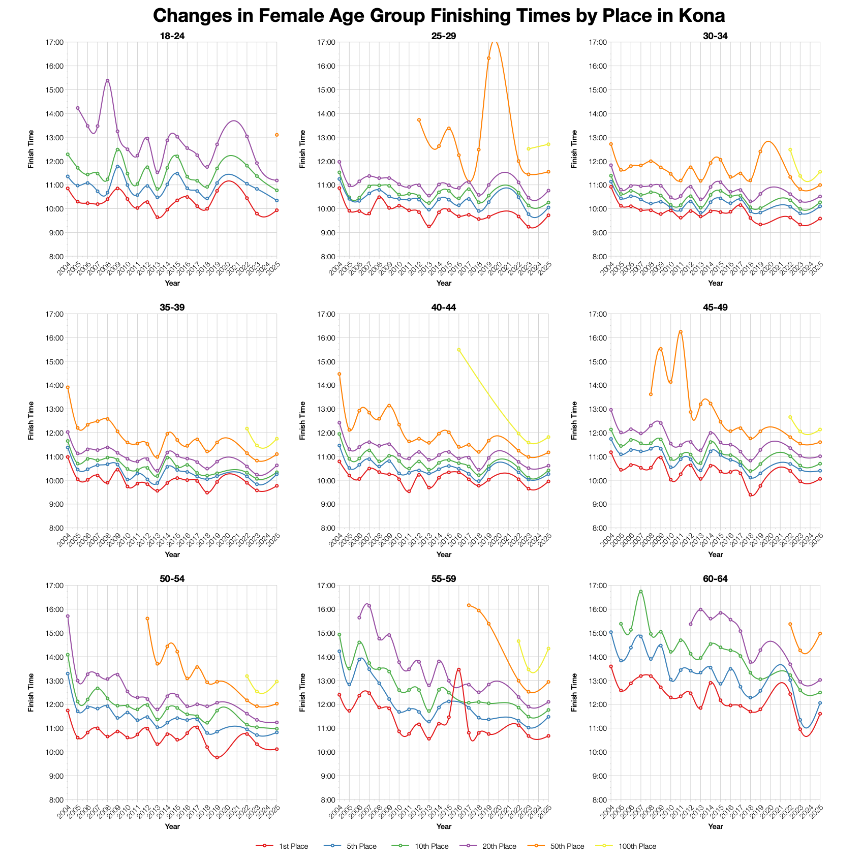 Tracking the times for specific places over the years shows Kona to be one of the more consistent races when considering the front of larger groups. We can see how the more recent races with more slots available opened up numbers allowing the largest age groups to exceed 100 athletes. Also how 2023 was a good year for most age groups and this year’s results line up well with recent years.
