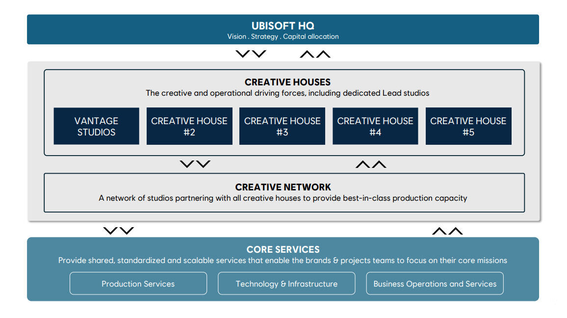 Como eje central de su transformación, la compañía implementará un nuevo modelo operativo descentralizado estructurado en cinco "Casas Creativas" (Creative Houses), cada una con plena responsabilidad financiera y especializada en géneros específicos. Estas divisiones incluyen Vantage Studios (enfocada en Assassin's Creed, Rainbow Six y Far Cry ), así como unidades dedicadas exclusivamente a shooters (The Division, Ghost Recon), experiencias "Live", mundos de fantasía narrativa y juegos familiares. Estas son las cinco casas anunciadas oficialmente por Ubisoft: