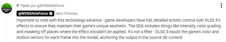 La avalancha de críticas han sido tal que NVIDIA ha añadido una pequeña nota en el vídeo de Youtube para aclarar que los desarrolladores todavía tienen todo el control artístico del efecto de DLSSS 5 para asegurar que cada creador puede mantener su estética única. "El SDK incluye ajustes para la intensidad, degradado de color y enmascarar lugares donde el efecto no se debería aplicar. No es un filtro, DLSS 5 recoge el color y vectores de movimiento de cada frame en el modelo, y lo asocia a la fuente de contenido 3D".
