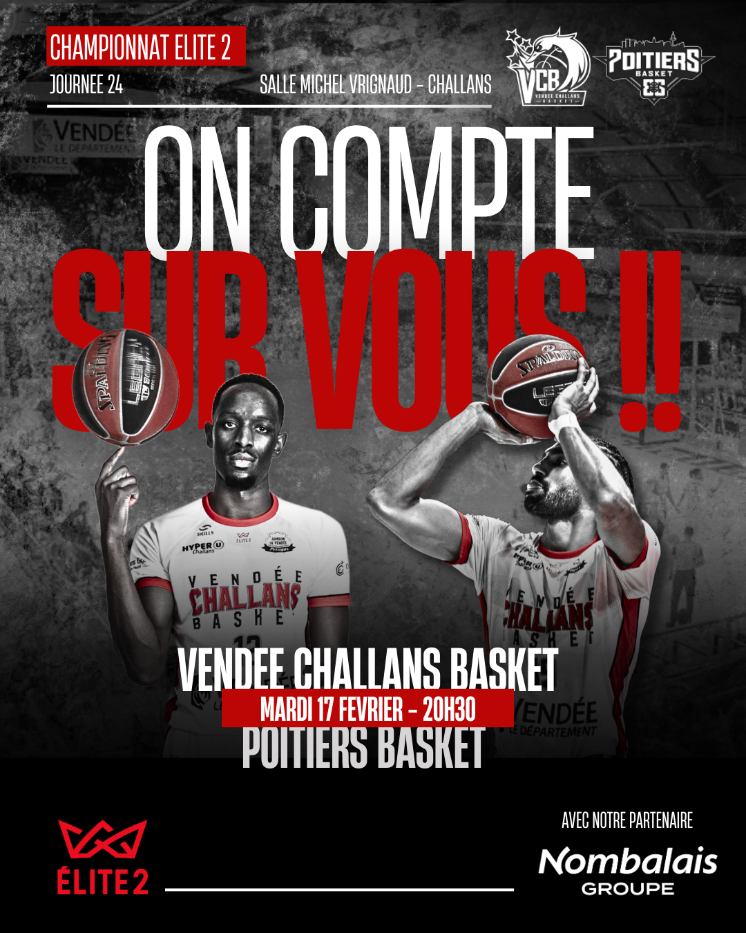 Après l’émotion et la superbe victoire lors de la soirée anniversaire des 90 ans du club, le Vendée Challans Basket retrouve son public dès mardi pour une nouvelle affiche de championnat Élite 2 face au Poitiers Basket 86. Une rencontre importante pour nos Challandais qui auront à cœur de confirmer la dynamique devant leur public et de poursuivre leur progression dans ce championnat exigeant.