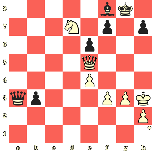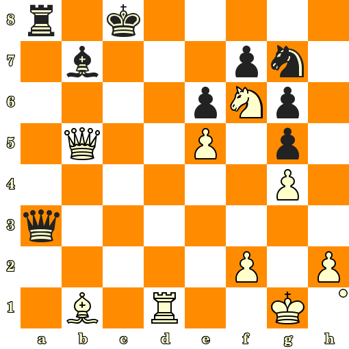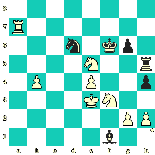Échec et mat en 4 coups : 1. Cf6+ Rh8 2. Dh5 h6 3. Dxf7 b2 4. Dg8#