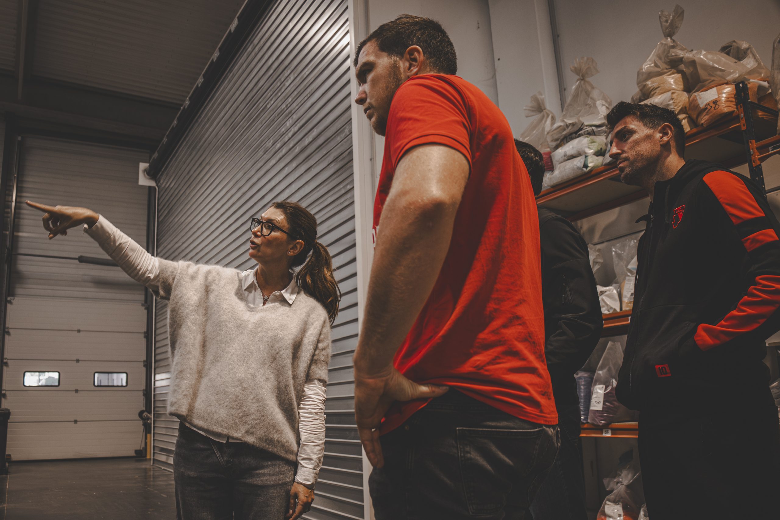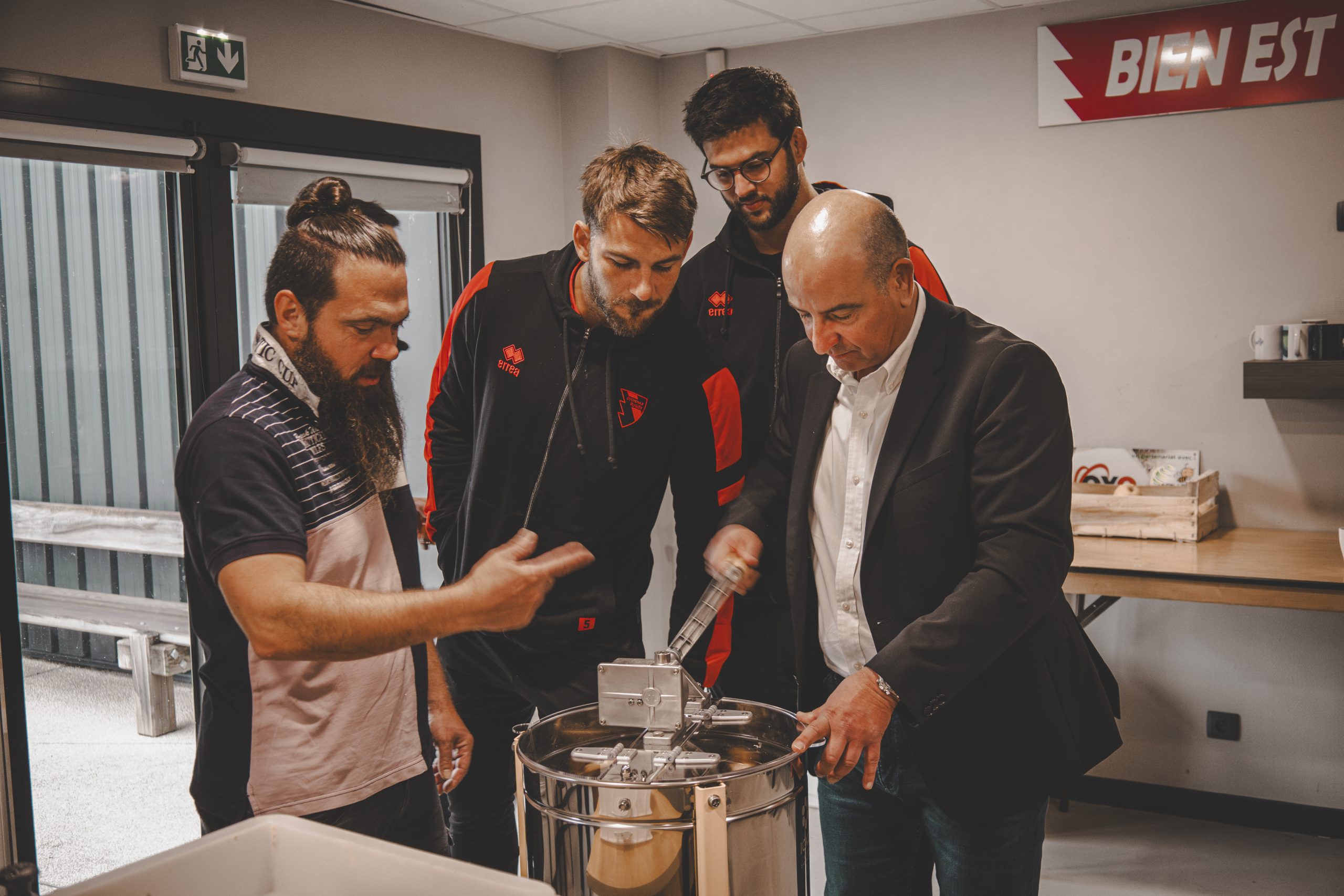 La journée a débuté à l’Oyomen Factory, où nos partenaires TMP Convert, Kapeci – Groupe Metalpe et Marron & Associés se sont retrouvés pour participer à la collecte produit par leur ruche installée sur notre centre d’entraînement. Deux de nos joueurs, Maëlan Rabut et Manuel Leindekar, étaient également présents pour prêter main-forte aux équipes et partager ce moment privilégié.