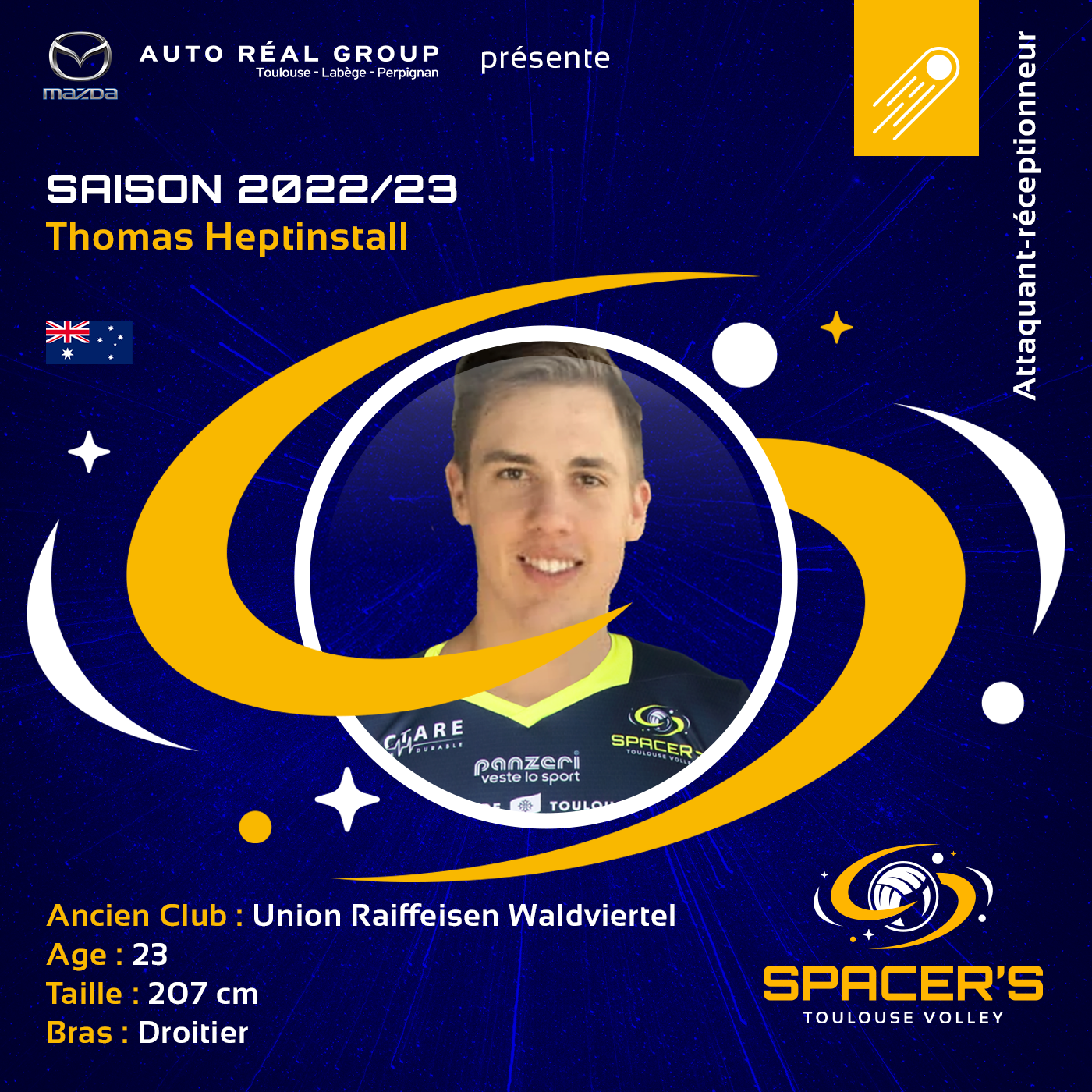 Le coach l’a trouvé en la personne de Thomas HEPTINSTALL qui viendra clore le recrutement des SPACER’S et qui rejoindra Antoine POTHRON, Deivid MOTTA et Thierry JAGUSZEWSKI aux postes d’attaquants-réceptionneurs. Joueur polyvalent, Thomas pourra suppléer Daniel CAGLIARI au poste de pointu.